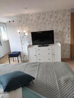 - Schlafzimmer No. 1 mit Boxspringbett (180 cm x 200 cm), 42″-TV, Einzelbett (90 cm x 200 cm), Kleiderschrank, Babybett und Wickelkommode