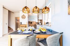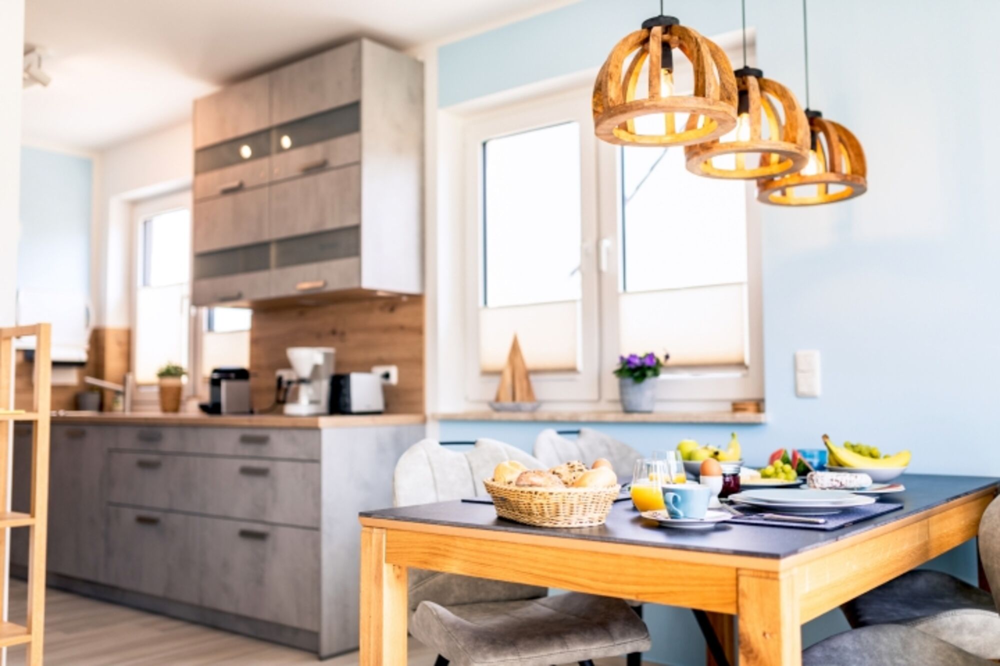 Im Erdgeschoss finden Sie einen kombinierten Wohn- und Essbereich, der geschmackvoll und komfortabel gestaltet ist. WLAN und Magenta TV mit Netflix sind in der Unterkunft kostenfrei vorhanden. Der angrenzende Küchenbereich lädt zum Verwöhnen ein, aufgrund der hochwertigen, vollständigen Ausstattung bleiben hier keine Wünsche offen. In dieser Etage steht ihnen auch ein Bad mit Fenster und Dusche zur Verfügung.