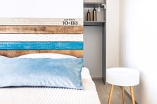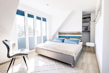 Das Obergeschoss des Hauses verfügt über zwei Schlafzimmer. In dem einen befindet sich ein bequemes, hochwertiges Boxspringbett mit angrenzendem begehbaren Kleiderschrank sowie ein Schreibtisch und Smart-TV. Im zweiten sind zwei Einzelbetten mit Einbauschrank und ebenfalls Smart-TV vorhanden. Das großzügige Badezimmer mit Fenster und ebenerdiger Dusche in moderner Beton-Optik runden den hohen Standard der Unterkunft ab.