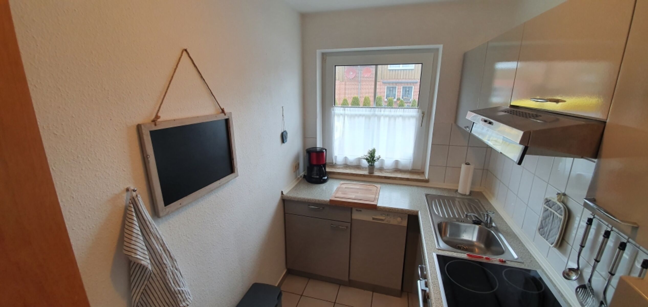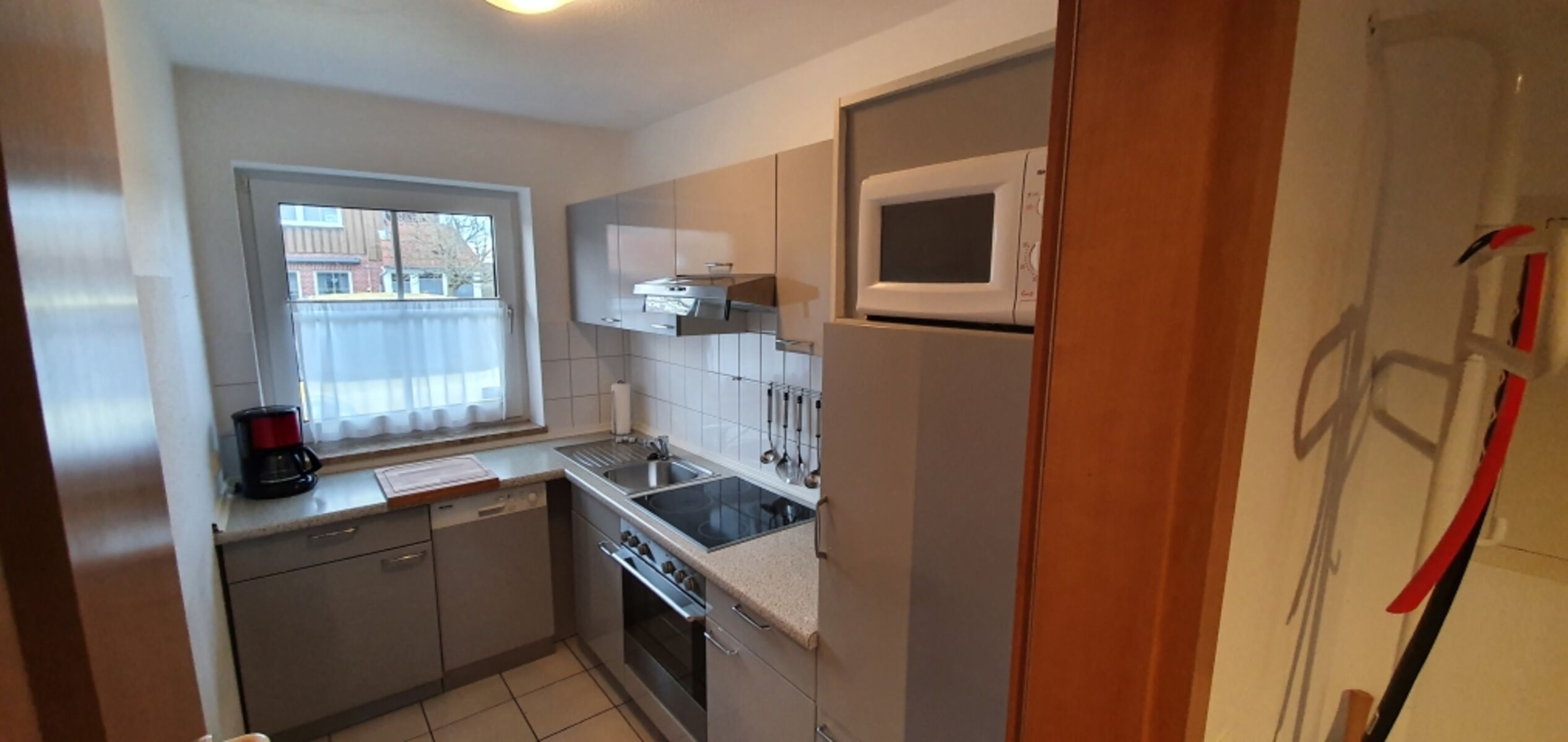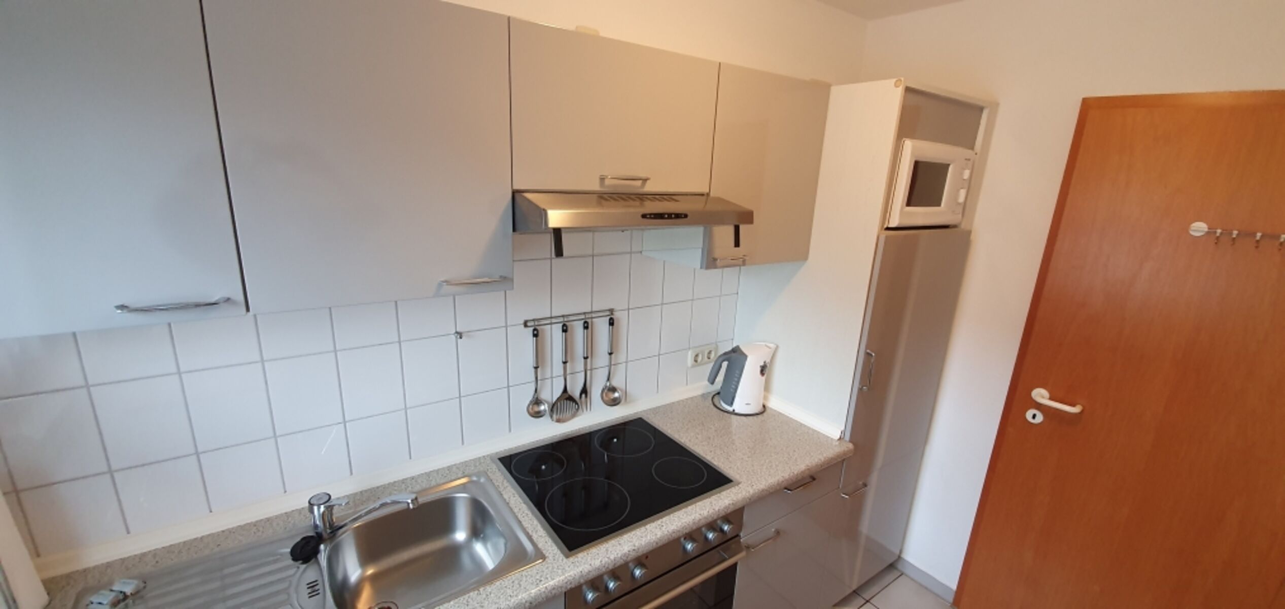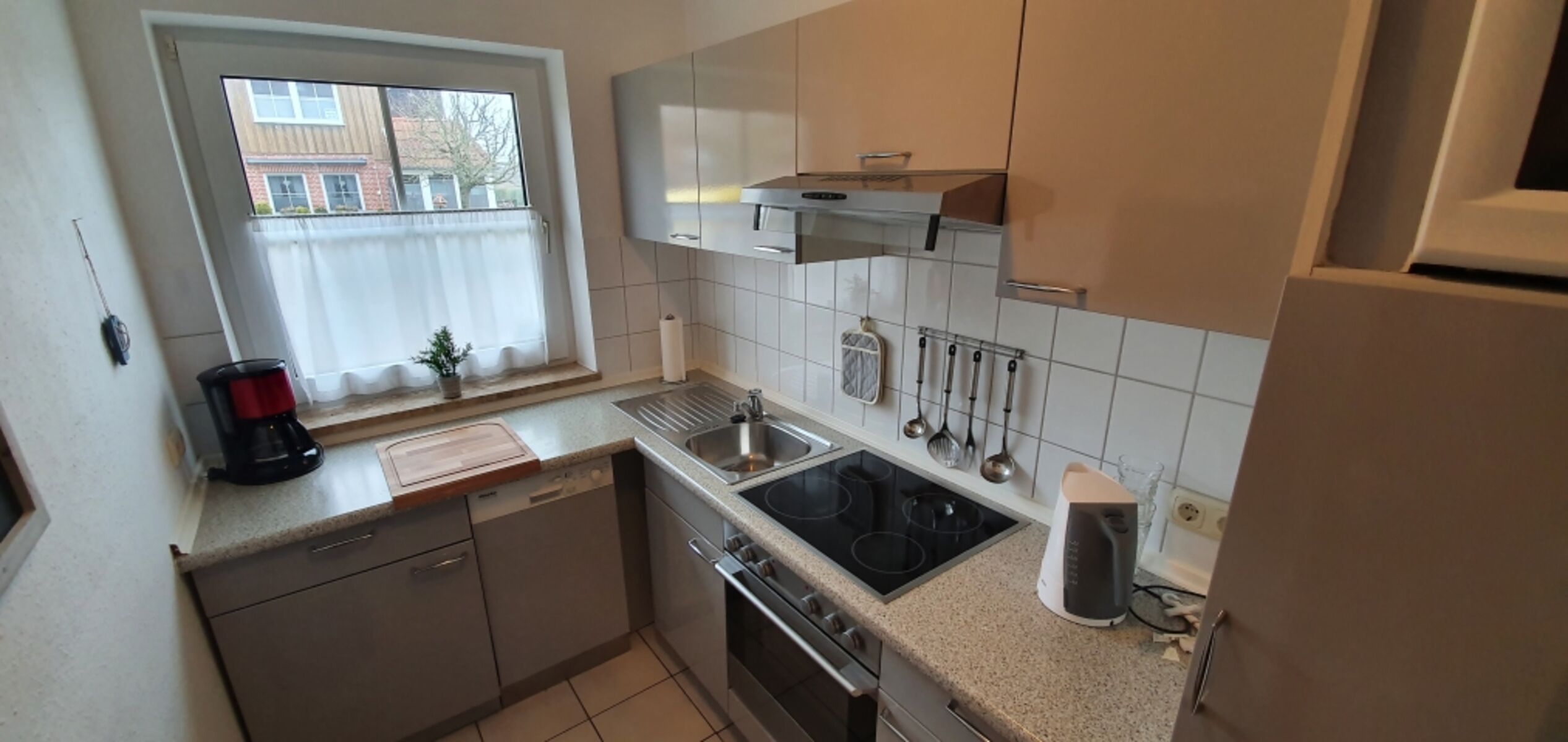 Cerankochfeld, Dunstabzugshaube, Kühlschrank mit Gefrierfach, Mixer, Korkenzieher / Flaschenöffner, Gewürze (Salz, Pfeffer, Zucker), Geschirrhandtücher, Mülltüten