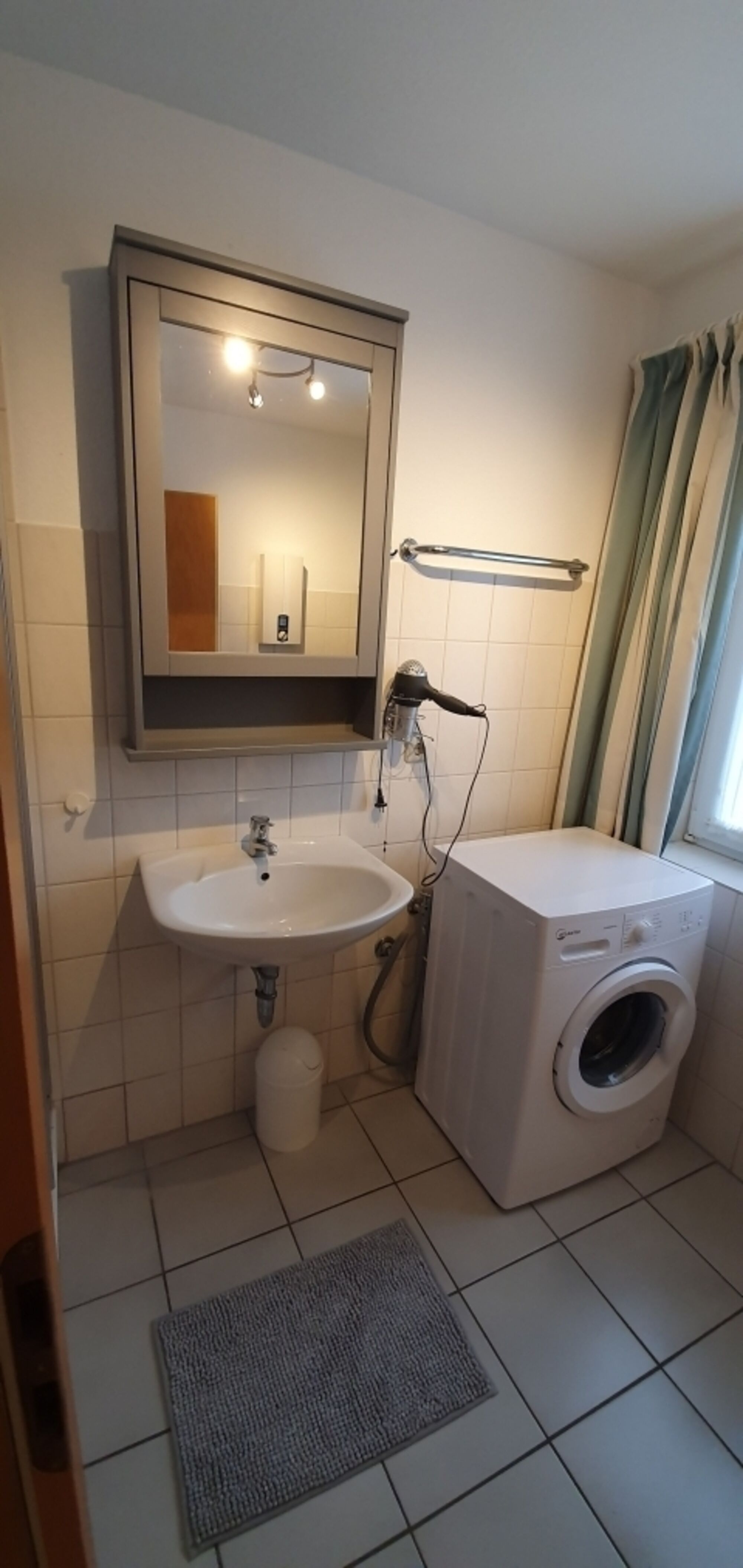 Waschbecken, Spiegel, Fenster im Bad