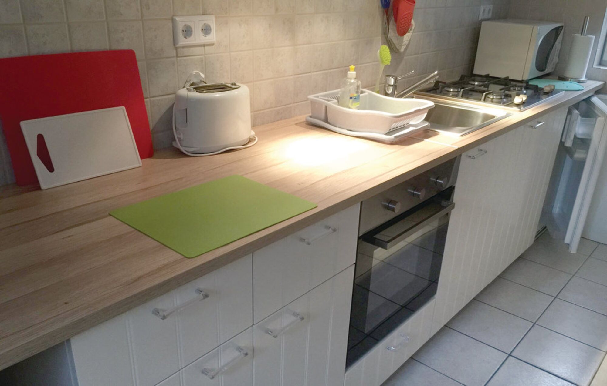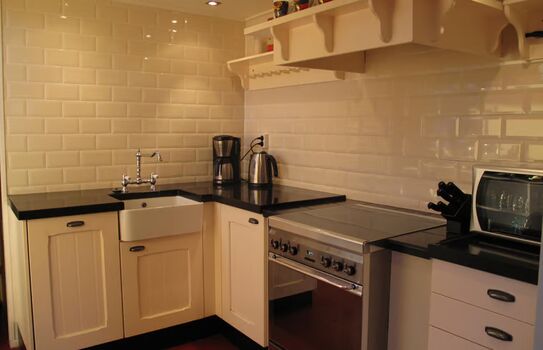4-Platten Herd, Gasofen / Gasherd, Kühlschrank mit Gefrierfach, Eierkocher, Essplatz in der Küche, TV in der Küche