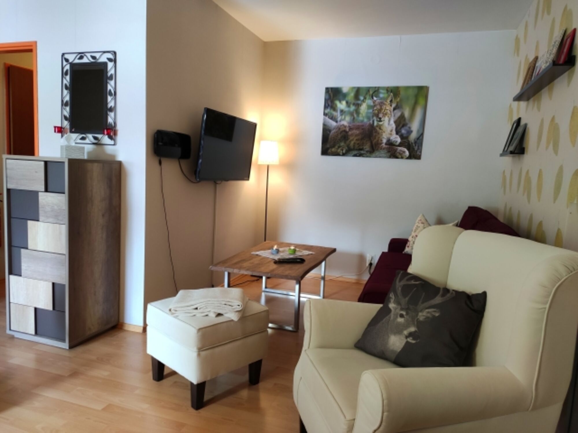 Der „Harzluchs“ in Hohegeiß liegt unmittelbar am Kurpark. In unserem Appartement im Hochparterre eines ruhigen Mehrparteienhauses finden drei Personen auf modern eingerichteten 45 m² Platz. Euer Vierbeiner ist herzlich willkommen! Ein gemütlicher Balkon mit Blick auf die Bergwiese und der Möglichkeit zu Grillen sowie eine kleine Sauna im Haus (gg. Gebühr) machen den Aufenthalt besonders angenehm. In der Küche sind sämtliche Utensilien zum Kochen vorhanden. Für Unterhaltung ist mit Büchern und Spielen, 42´´ HD Smart-TV inklusive Waipu TV, Netflix, BluRay-Player, Stereoanlage und Highspeed-WLAN bestens gesorgt. Im Keller befindet sich ein Tischtennisraum.