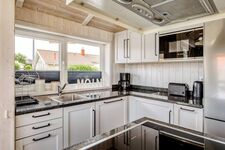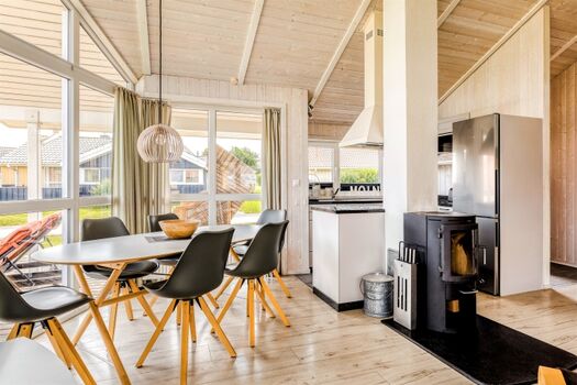 Ausserdem erwartet Sie im Haus ein lichtdurchfluteter Wohn-und Essbereich mit integrierter, moderner Küche, die keine Wünsche für ein gemeinsames Kochen und Beisammensein offen lässt. Im Mittelpunkt des Wohnbereichs steht ein Kaminofen, der auch bei pustigem Ostseewetter für behagliche Wärme und Gemütlichkeit sorgt.