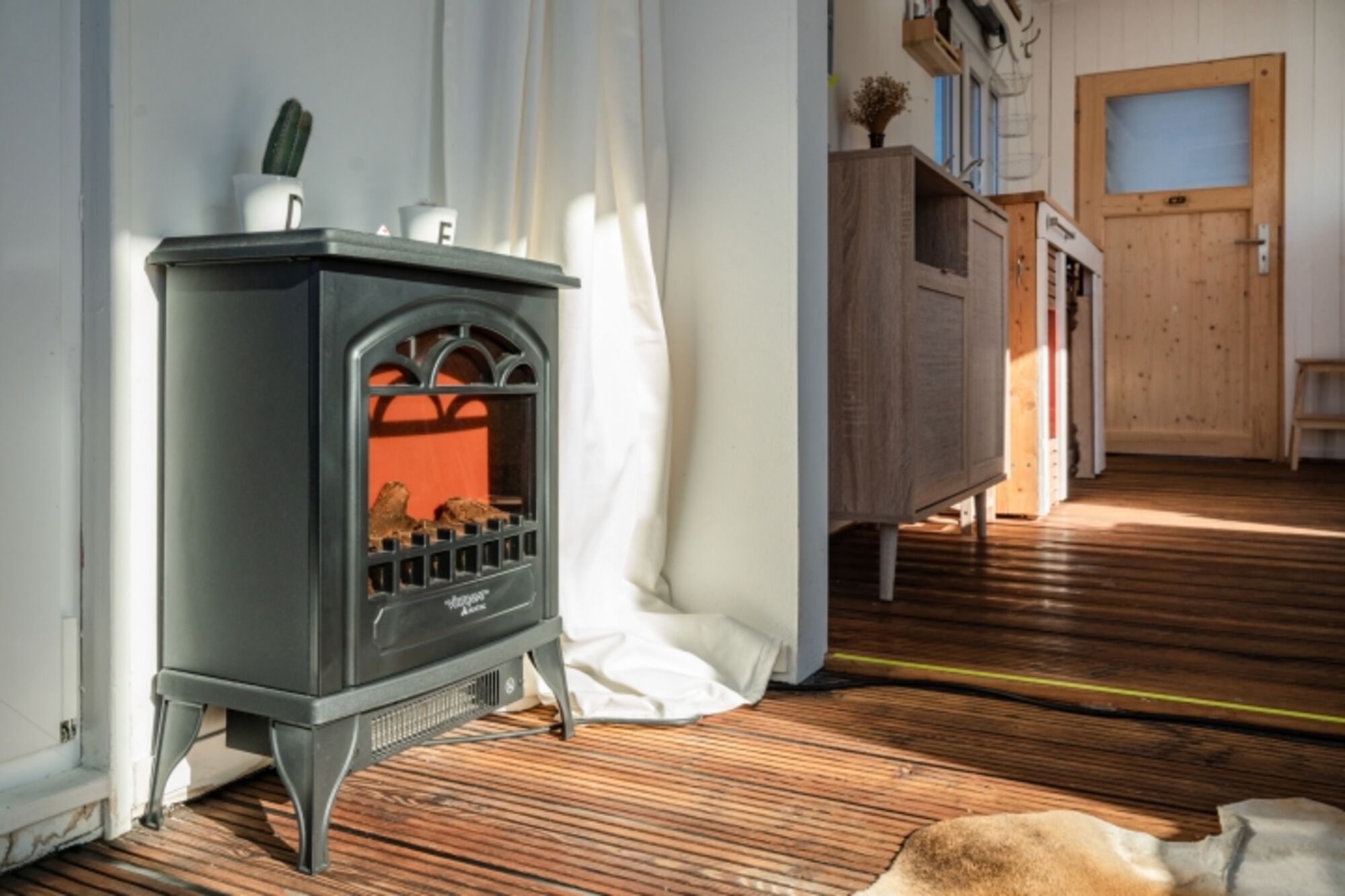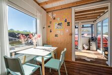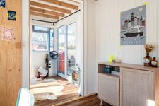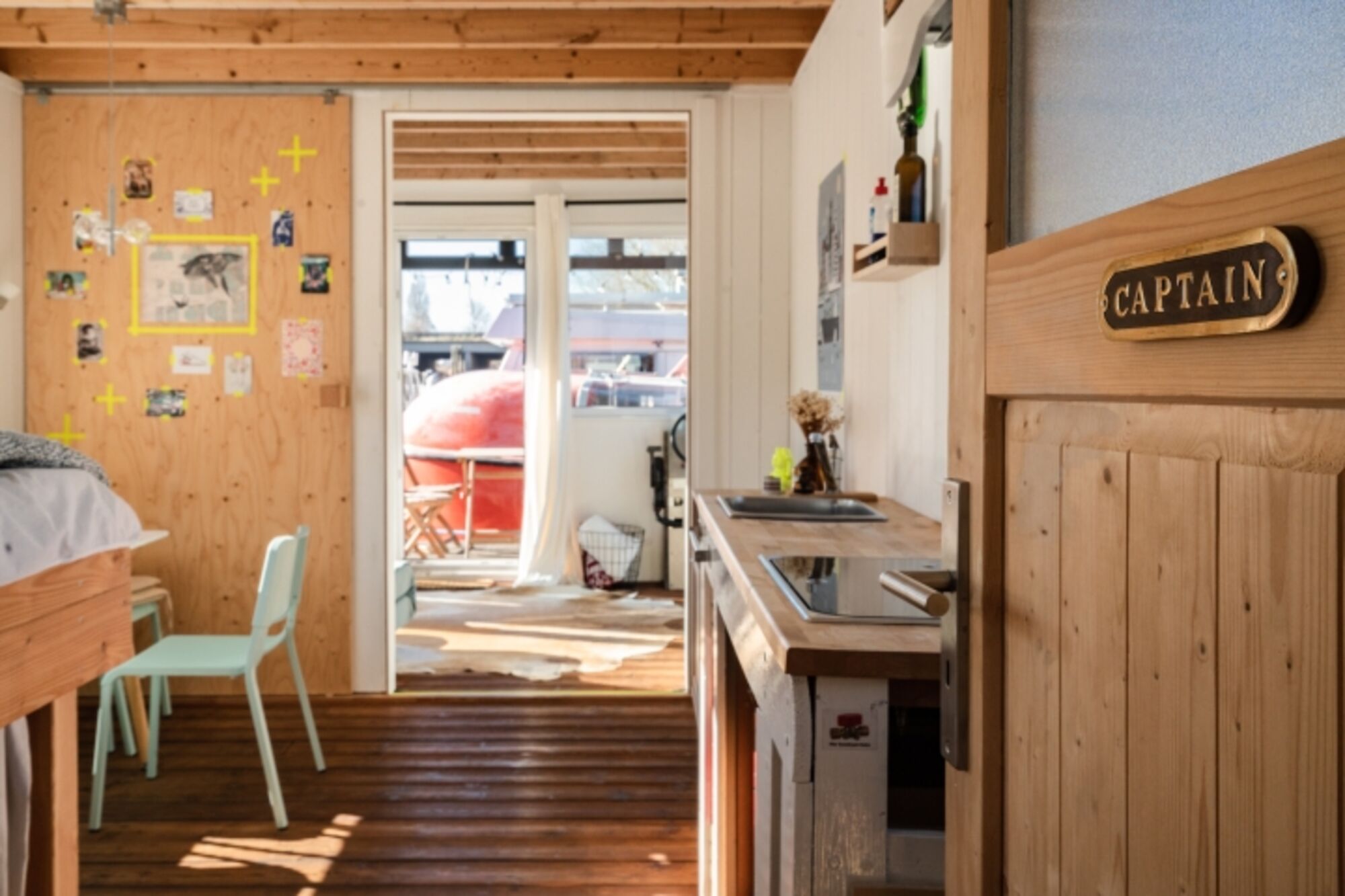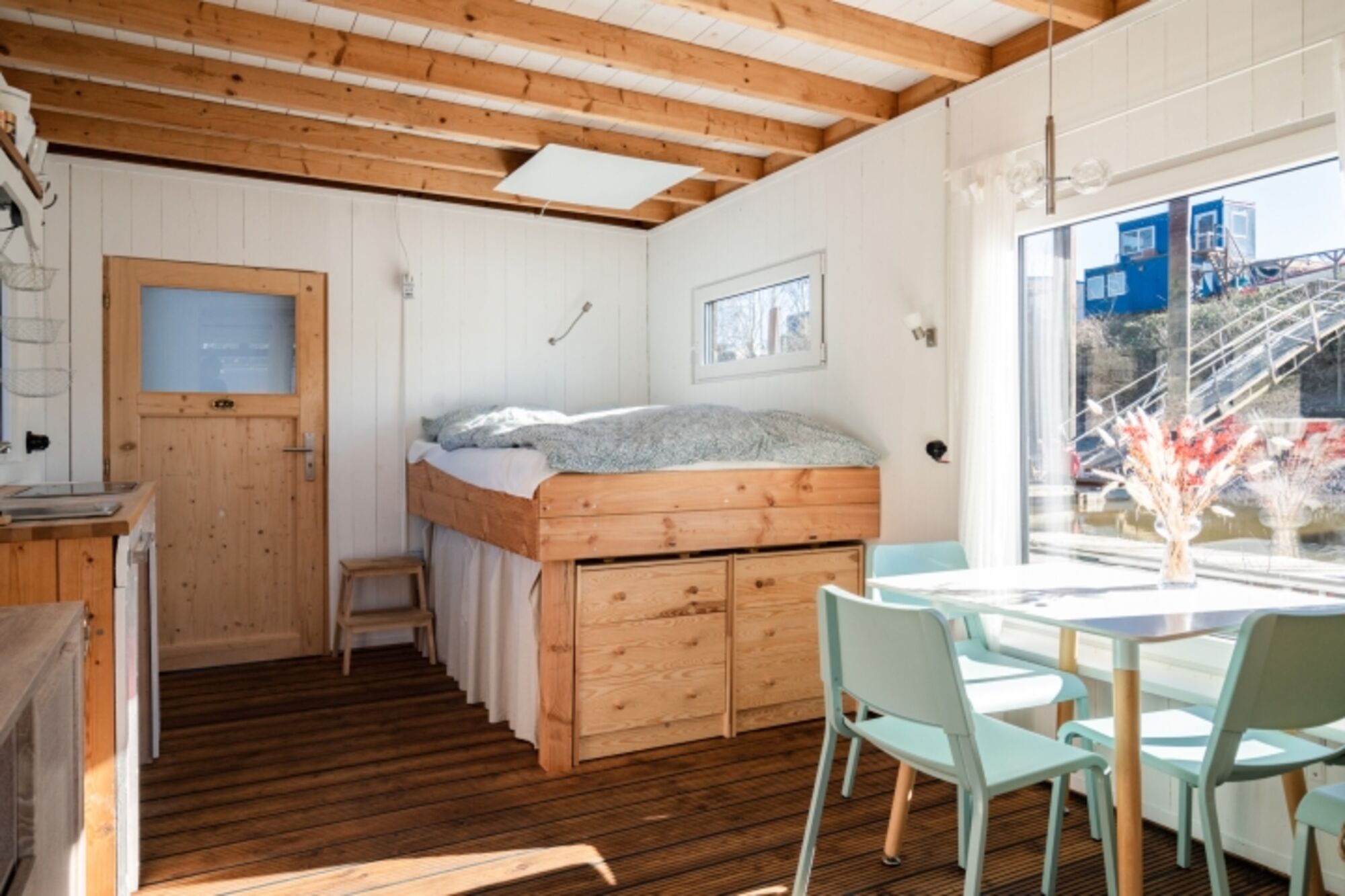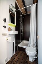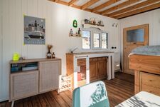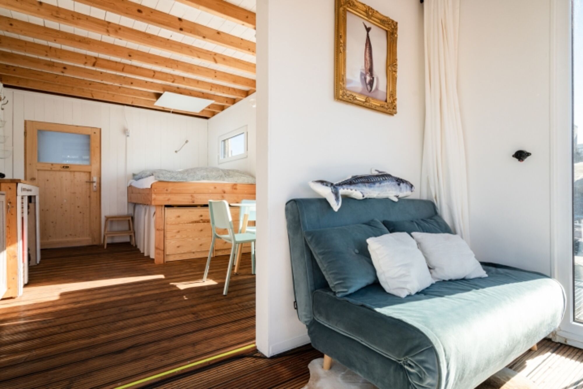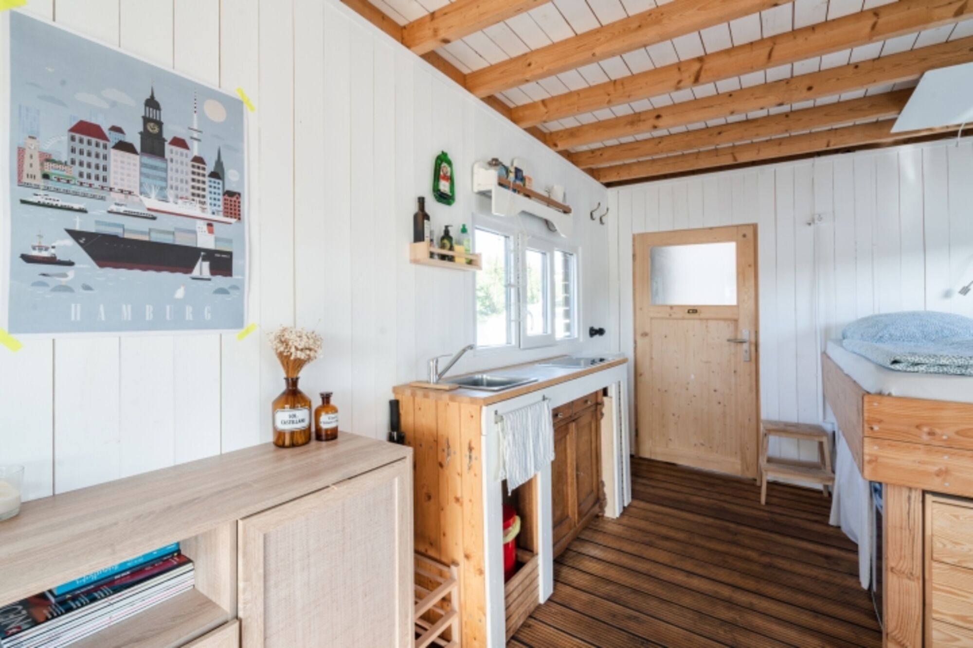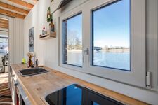 Durch die Haustür kommend, tretet ihr zuerst ins Bad mit kleiner Wasserschiffstoilette und normal großer Dusche. Von dort aus gelangt ihr in den Hauptraum mit Bett (1,40 m breite, gemütliche Matratze), Küchenzeile und Esstisch. Die Küchenzeile mit 2-Platten-Gasherd und kleinem Kühlschrank bietet alles, was ihr zum einfachen Kochen benötigt, und durch das Fenster lassen sich dabei häufig vorbeischwimmende Enten beobachten. Der Hauptraum kann durch eine einfache Schiebetür vom vordersten Raum, dem "Wohnzimmer", getrennt werden. Dort steht das Schlafsofa (1,20 m breit) und bodentiefe Fenster bieten hier auf einer Seite einen schönen Blick aufs Wasser. Die anschließende kleine Terrasse lädt besonders bei schönem Wetter zum Frühstücken, Kaffee trinken und Entspannen ein. In einem Hängesessel könnt ihr euch sanft hin und her schaukeln lassen.