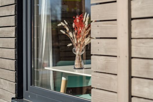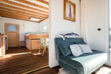 Verglaster Wohnbereich mit Zugang zur kleinen Terrasse. 1,20 m breite Schlafcouch.