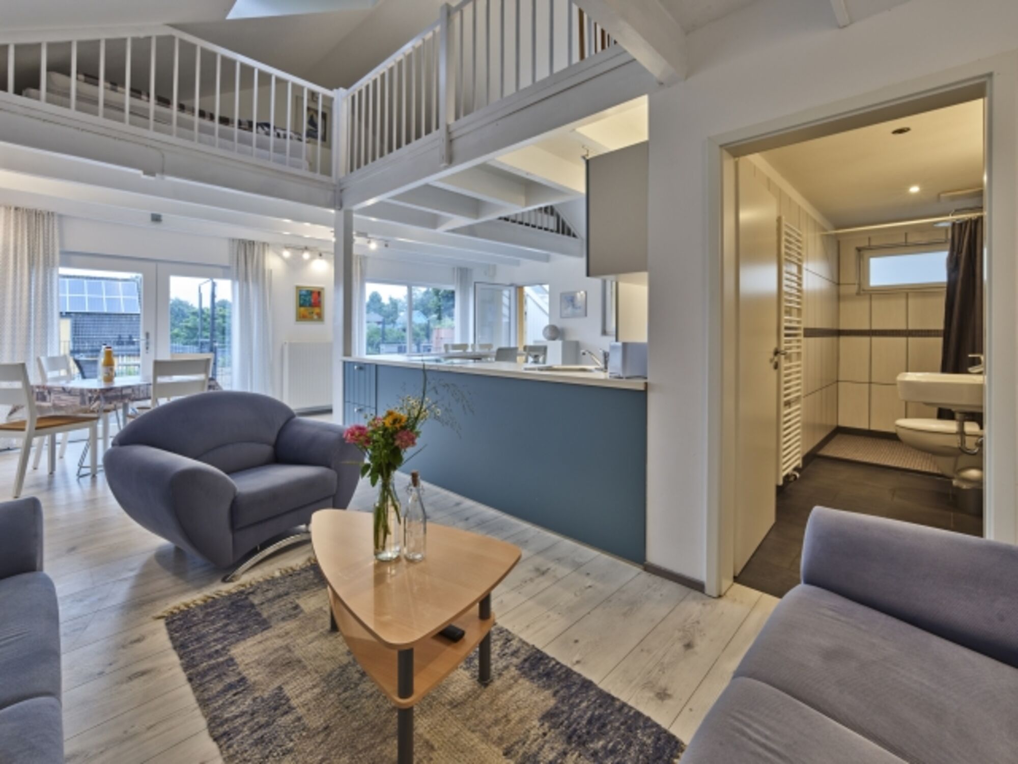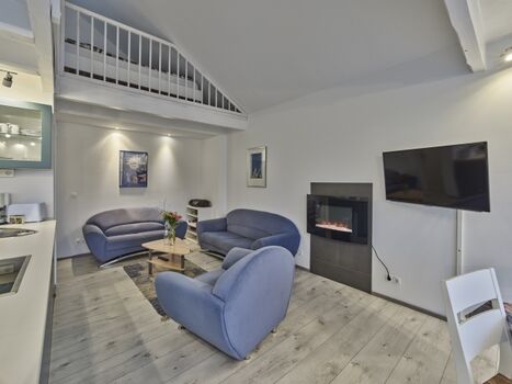 Das 80m² große Appartement verfügt über einen großen Wohn-/Essbereich und eine Gallerie, auf der sich die Betten befinden.