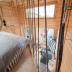 Das Tiny-Hausboot besteht aus einem Raum, nur das Bad ist abgetrennt und die Schlafebene ist oben. Im Wohnbereich befindet sich die Küchenzeile, ein Holzofen, ein klappbares (Schlaf)Sofa, ein Schrank, ein Couchtisch und ein Sitzsack. Bei gutem Wetter kann man wunderbar auf der angrenzenden Terrasse sitzen, dort gibt es einen Esstisch.