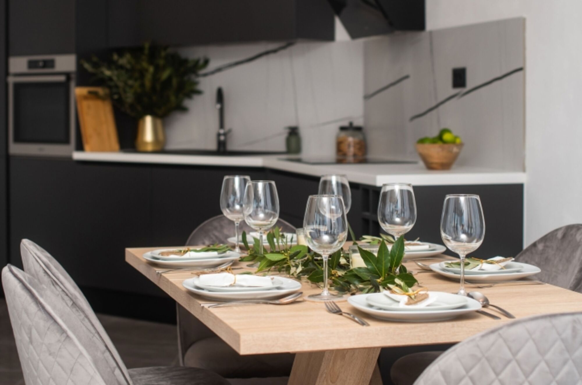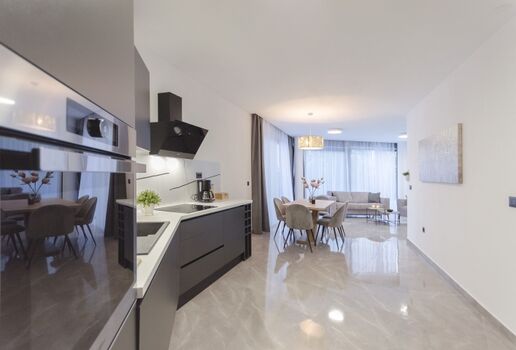 Die Wohnung befindet sich im Erdgeschoss und verfügt über zwei Schlafzimmer, ein Badezimmer und eine große Küche mit Ess- und Wohnzimmer.