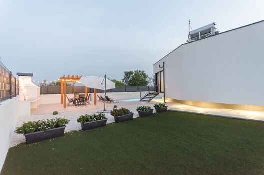 Liegewiese, Gartenmöbel, Holzgrill, Hof, Außenkamin