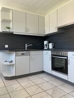 Cerankochfeld, Dunstabzugshaube, Kühlschrank mit Gefrierfach, Geschirrhandtücher, Essplatz in der Küche