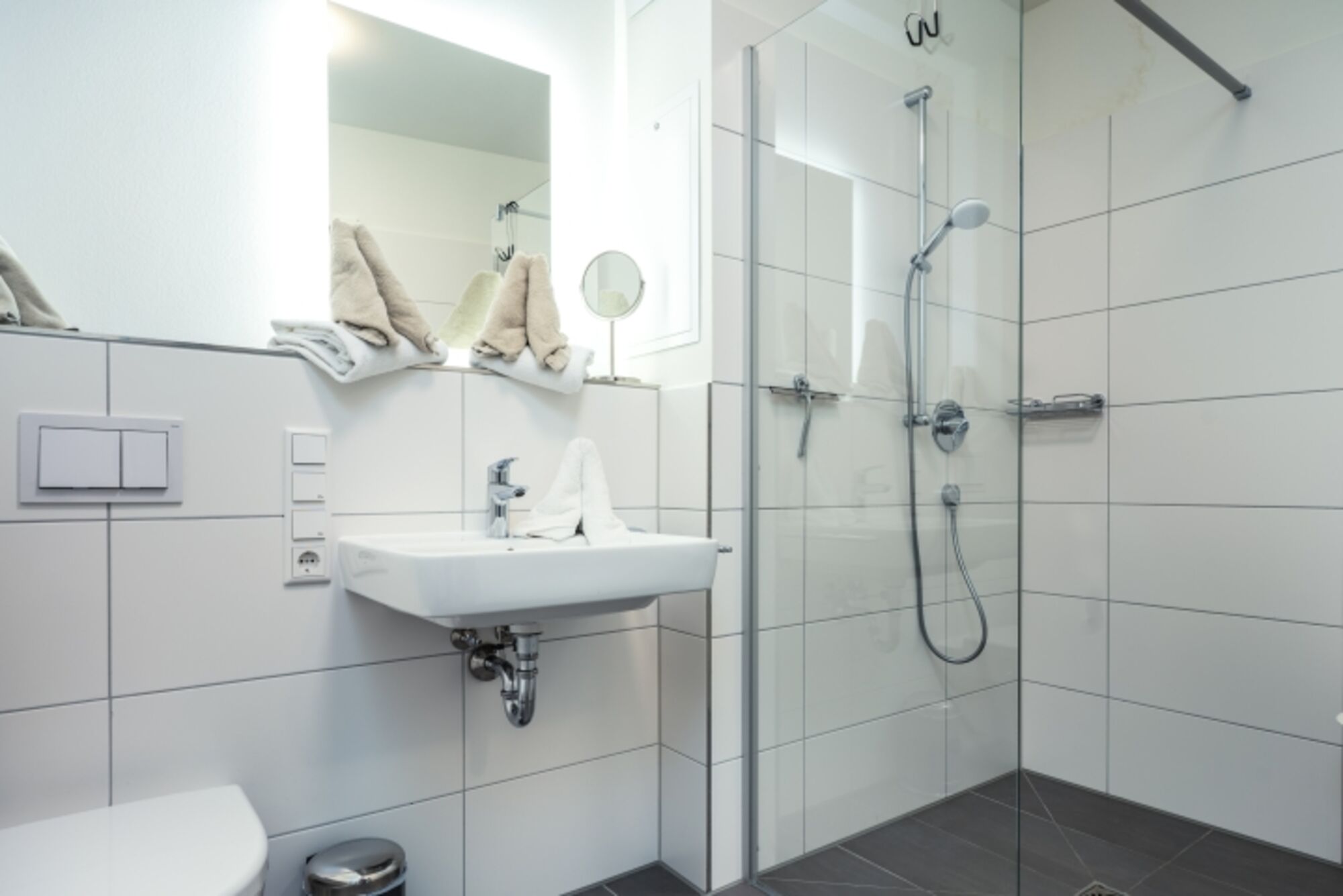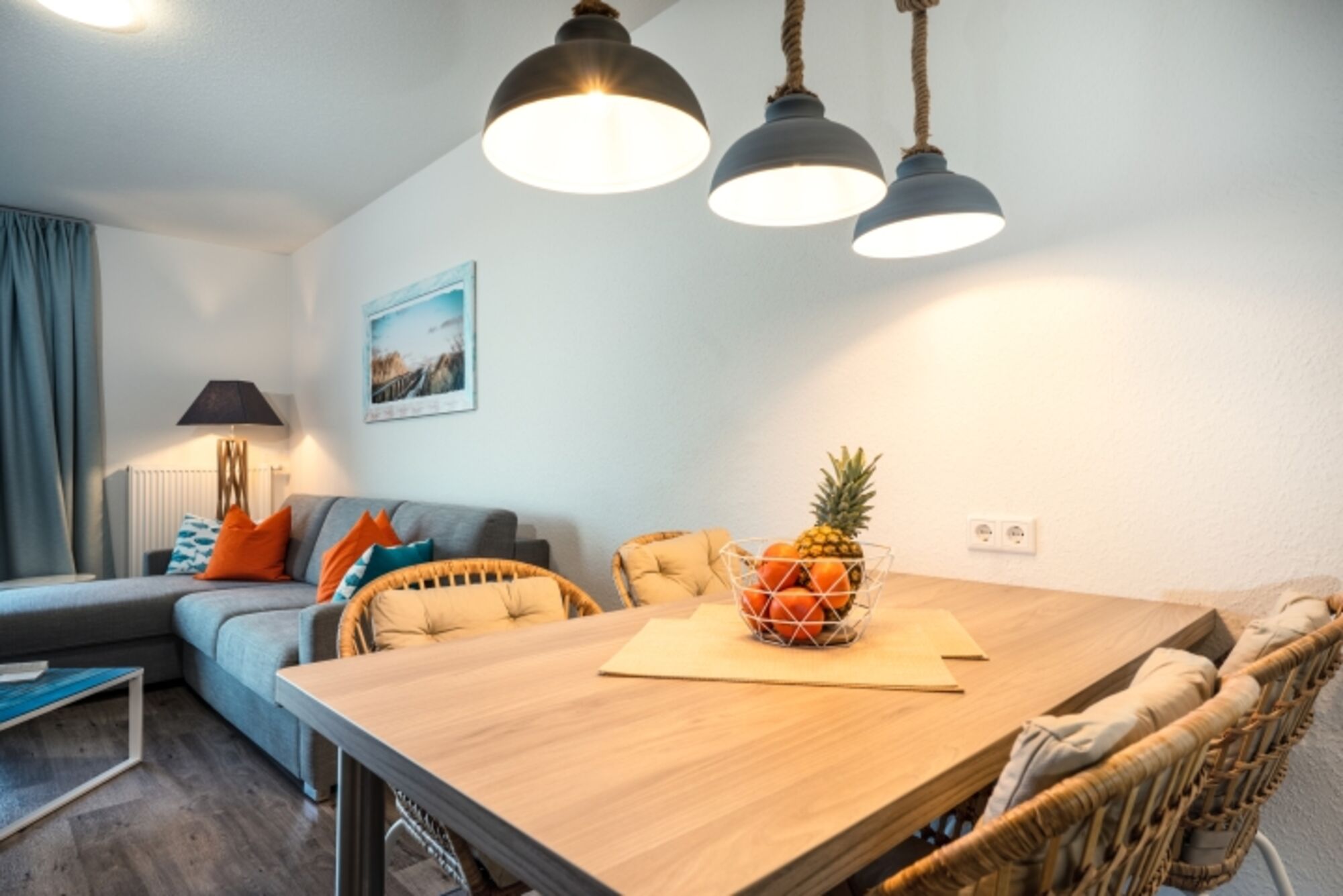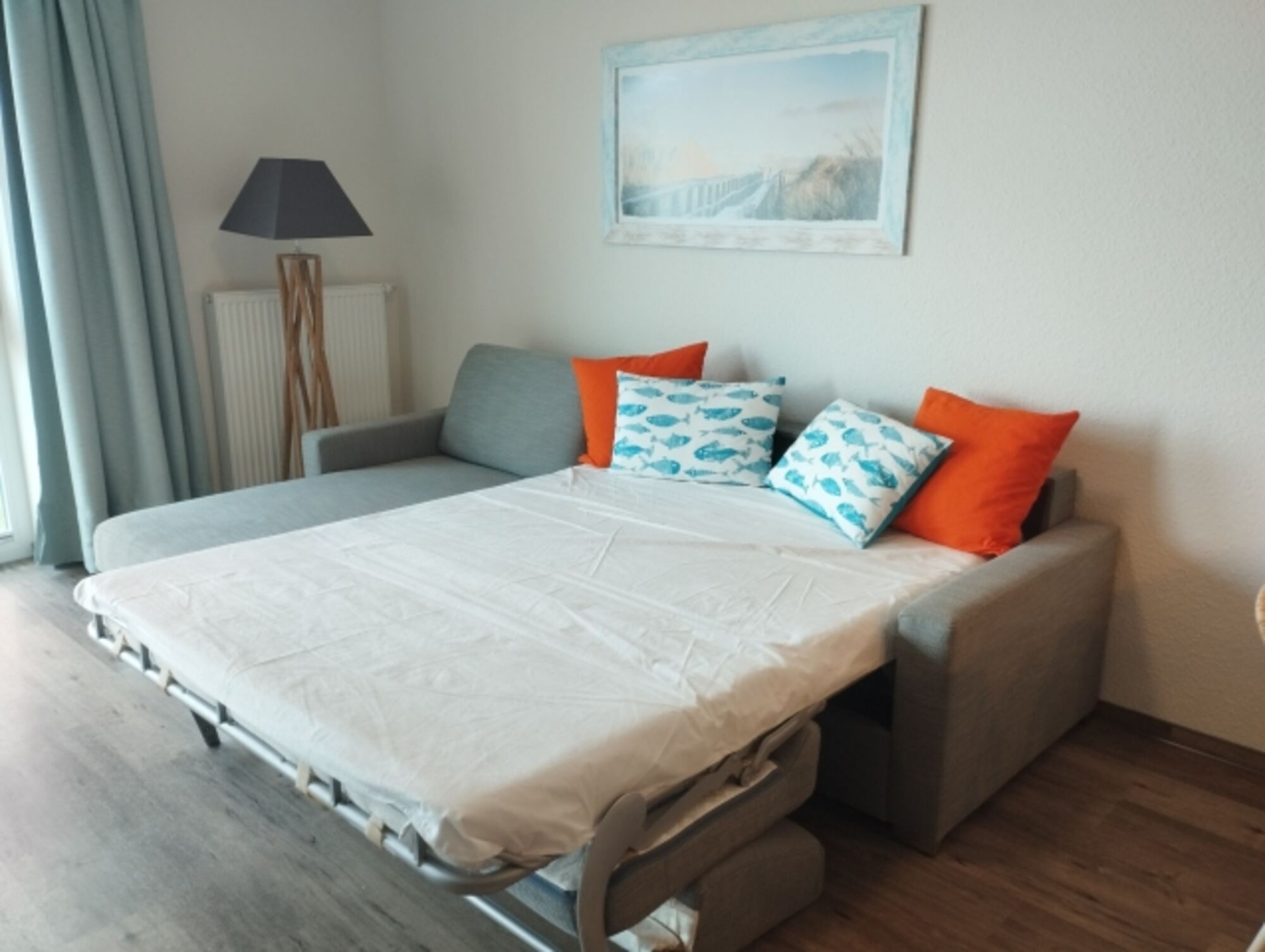 Die Ferienwohnung haben wir komfortabel und hochwertig, in Anlehnung an den Beach House Style, eingerichtet. Sie verfügt über 1 Schlafzimmer und ein zusätzliches Schlafsofa im Wohnzimmer. Dadurch können bis max. 4 Personen einen unvergesslichen Urlaub erleben. Sie haben einen schönen Blick über das Meer und den Hafen von Olpenitz. Die Wohnung ist stufenlos erreichbar und eignet sich daher auch sehr gut für Senioren und Menschen mit leichten körperlichen Einschränkungen. Das Appartement ist wie folgt aufgeteilt: 1. Schlafzimmer mit Doppelbett auseinanderschieben kann; Wohn-Schlafraum mit Doppelbettcouch; separater Essplatz; voll ausgestatteter Küchenbereich mit Geschirrspüler; Bad mit Dusche/WC; Terrasse mit direktem Seeblick; SAT-TV und SKY. Ihre Fahrräder stehen sicher im Fahrradkeller.