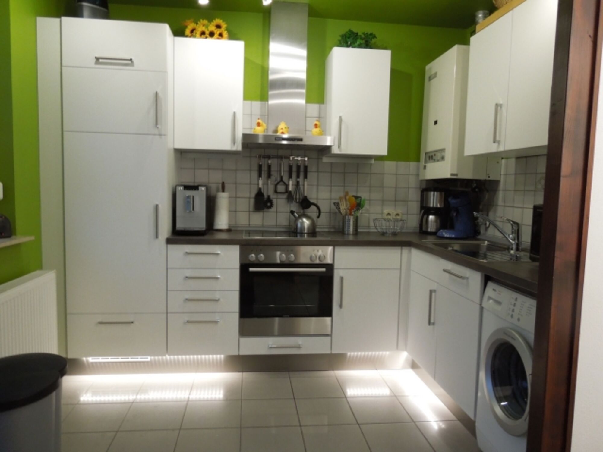 4-Platten Herd, Cerankochfeld, Dunstabzugshaube, Kühlschrank mit Gefrierfach, Kaffeevollautomat, Senseo-Kaffeeautomat, Eierkocher, Küchenmaschine, Mixer, Korkenzieher / Flaschenöffner