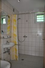 Waschbecken, Regendusche, Spiegel, Fenster im Bad, Fliegengitter