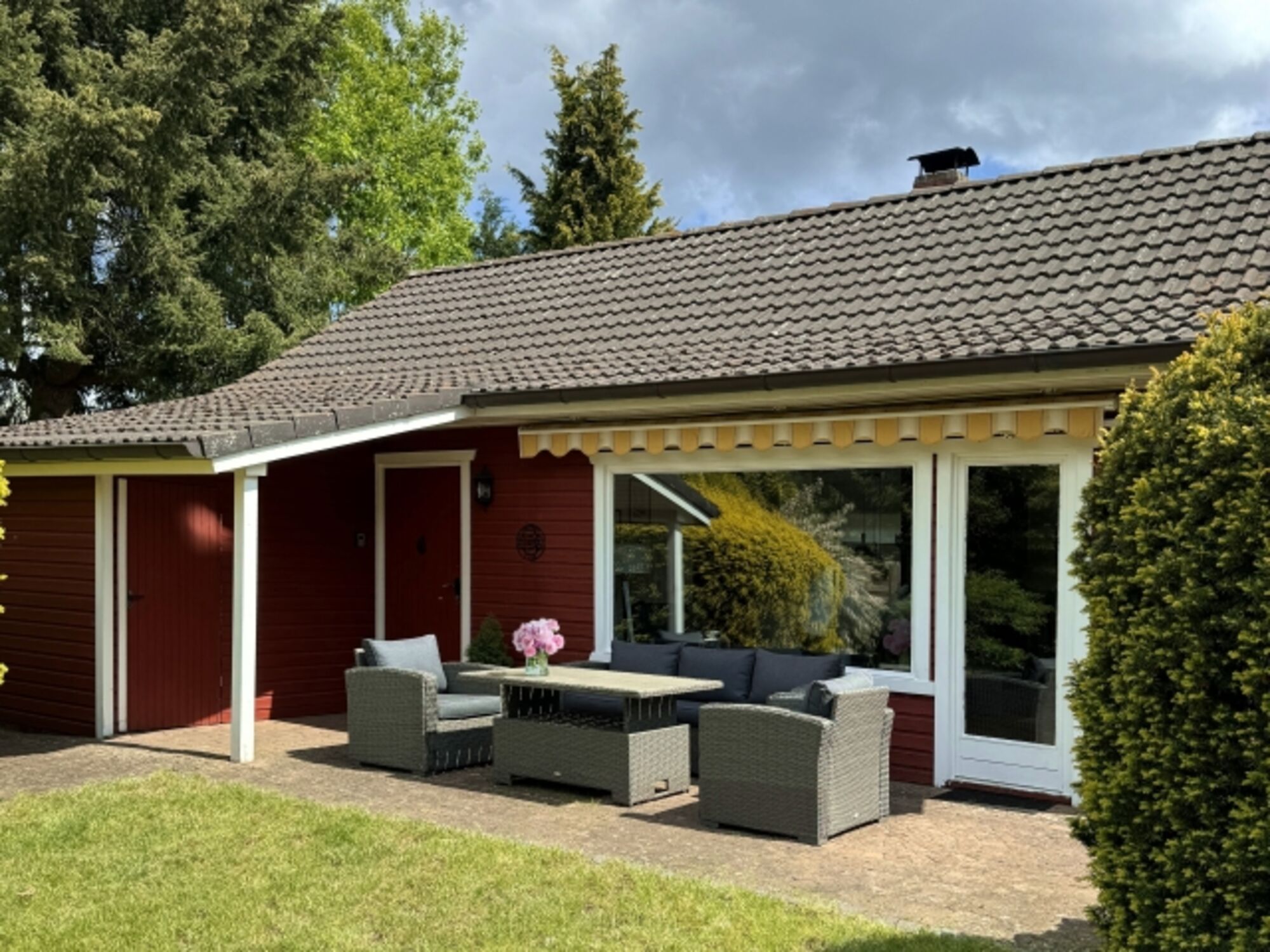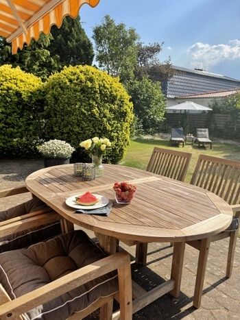 Liegewiese, Strandkorb, Gartenmöbel, Kohlegrill, Bänke, Balkonmöbel, Markise, Überdachte Terrasse (mobil), Windschutz