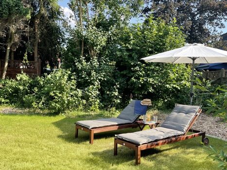 Neben Ruhe und Privatsphäre bietet der Garten von morgens bis abends Sonnenlicht und Platz für die Vierbeiner und ist dabei nahezu uneinsehbar. Für besondere Entspannungsmomente bei einem Glas Wein oder einem spannenden Buch ist Platz auf den Sonnenliegen.
