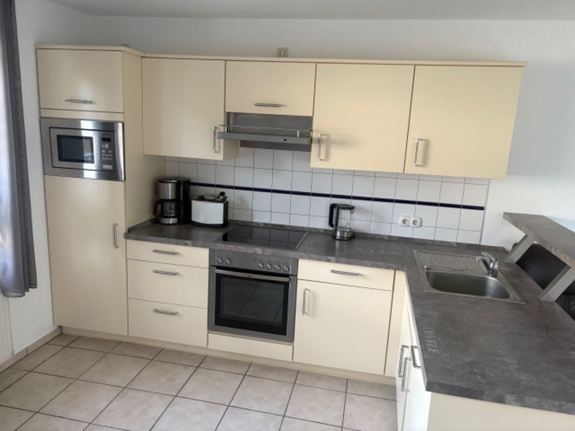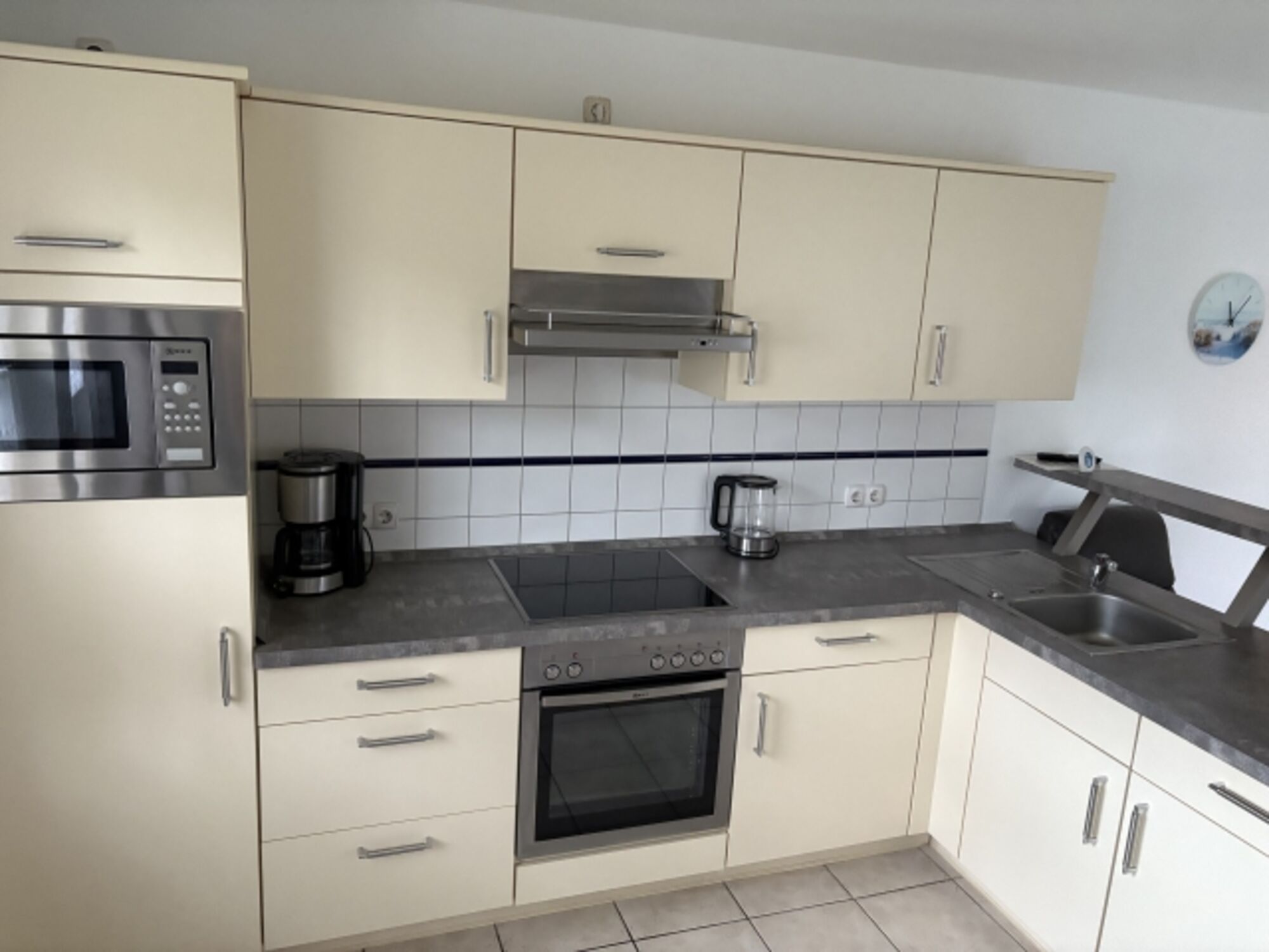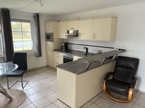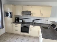 4-Platten Herd, Cerankochfeld, Dunstabzugshaube, Kühlschrank mit Gefrierfach, Mixer, Korkenzieher / Flaschenöffner, Mülltüten, TV in der Küche
