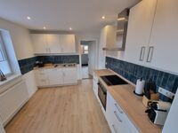 Die Einbauküche hat alles, was man braucht: Herd mit Backofen, Geschirrspülmaschine, Toaster, Kaffeemaschine, Wasserkocher und vieles mehr.