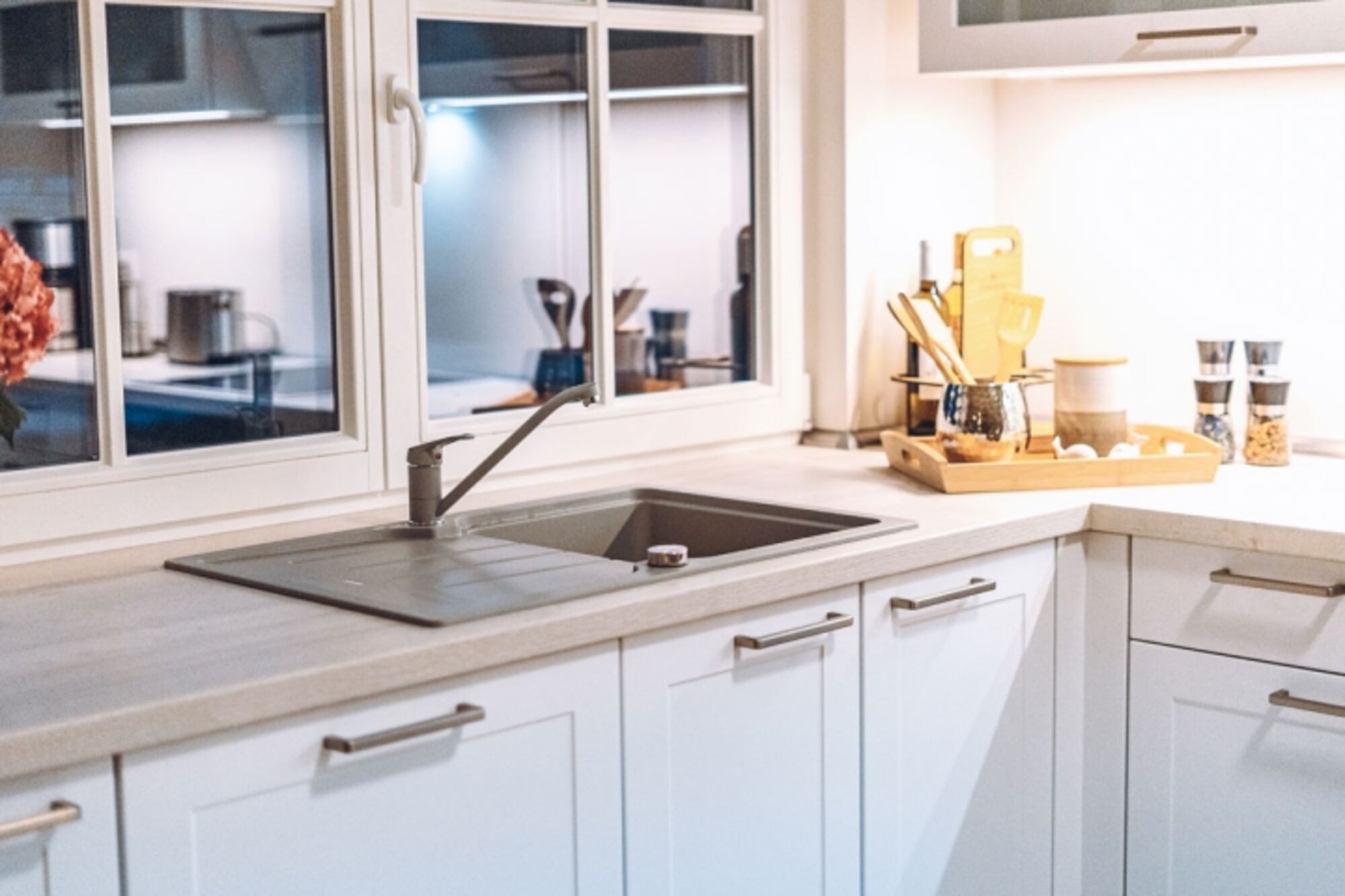 Cerankochfeld, Induktionsherd, Dunstabzugshaube, Kühlschrank mit Gefrierfach, Korkenzieher / Flaschenöffner, Essplatz in der Küche