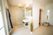 Saunabreich mit Ausgang zum Garten Waschbecken, Regendusche, Spiegel, Fenster im Bad