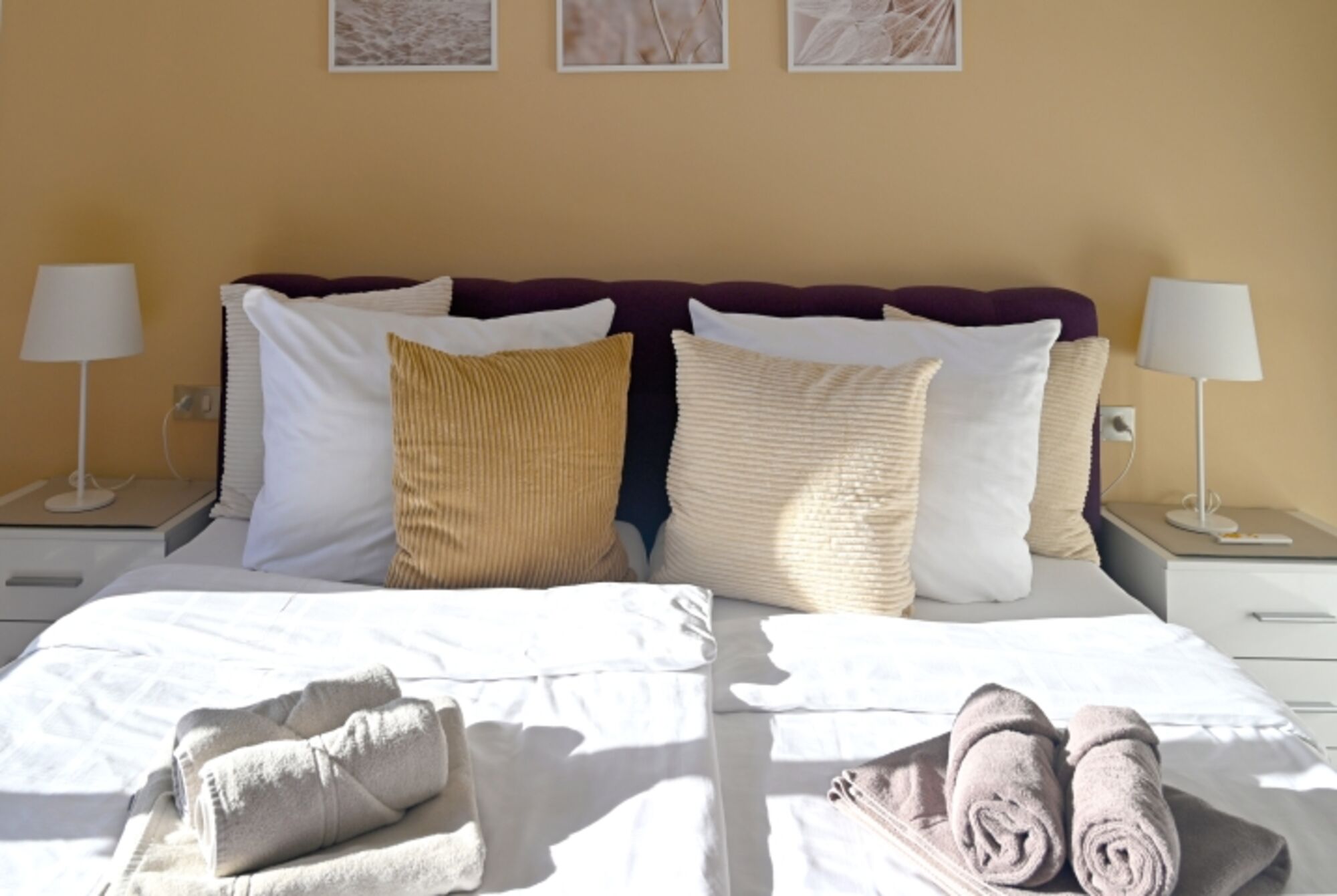 2 Schlafzimmern (1 x Doppelbett, 1 x 2 Betten) mit guten Lattenrosten und Matratzen und leichten, kochfesten Steppbetten und Kopfkissen aus Microfaser-Feinbatist