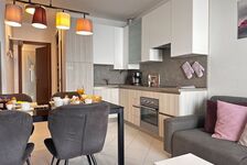 Küche mit Induktions-Kochfeld, Backofen, Spülmaschine, Großer Kühlschrank mit Gefrierteil, Kaffeemaschine, Wasserkocher, Toaster, Kochutensilien, Geschirr und Gläsern