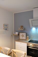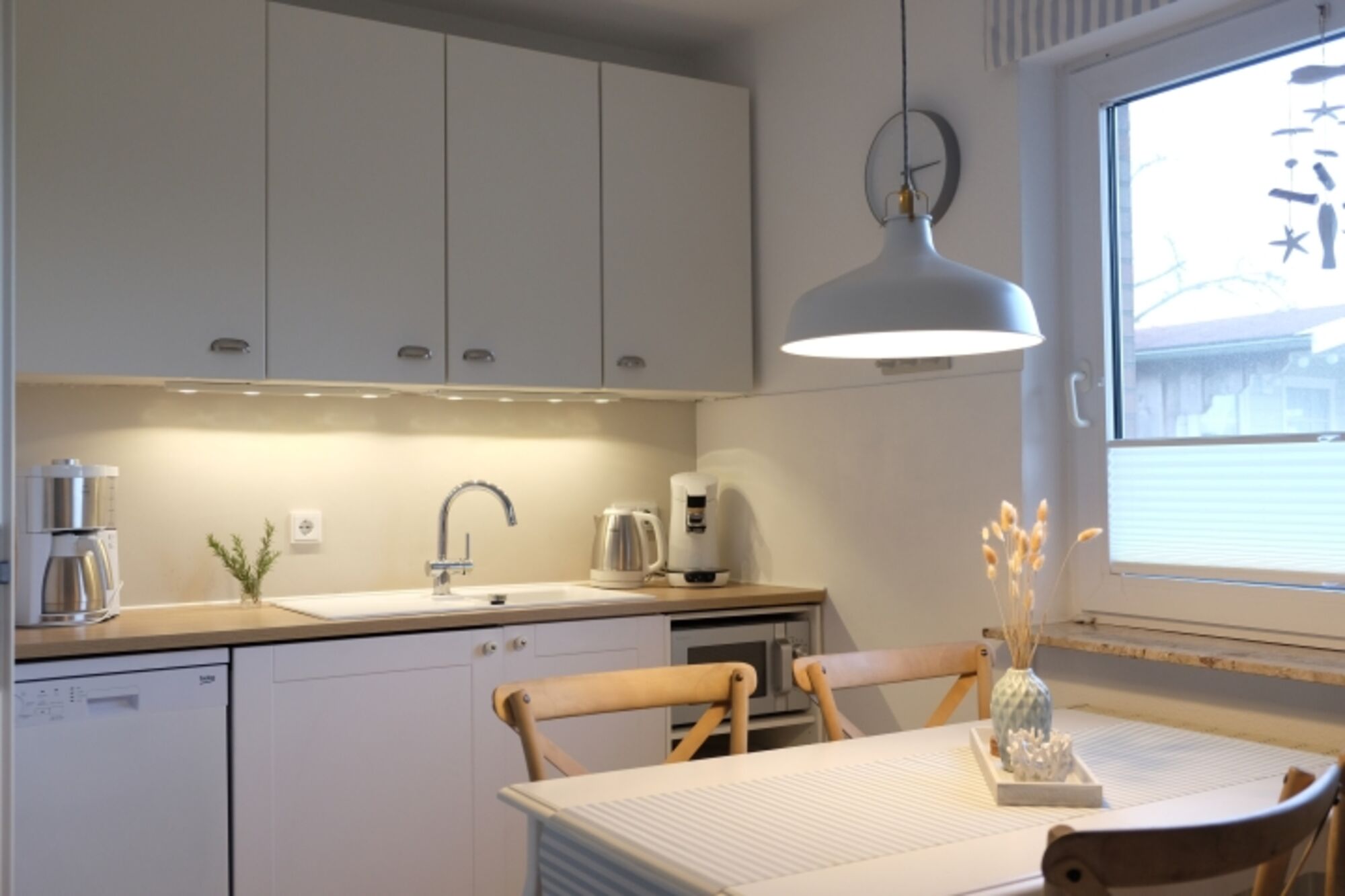 Cerankochfeld, Dunstabzugshaube, Kühlschrank mit Gefrierfach, Senseo-Kaffeeautomat, Eierkocher, Mixer, Elekt. Fruchtpresse, Waffeleisen, Korkenzieher / Flaschenöffner, Gewürze (Salz, Pfeffer, Zucker), Öl / Essig, Geschirrhandtücher, Essplatz in der Küche