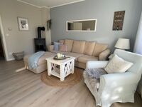Das helle und gemütlich eingerichtete Ferienhaus verfügt im Erdgeschoss über ein Wohnzimmer mit Couch, Lesesessel und Kamin, ein G-WC mit Fenster, eine Diele, sowie eine vollausgestattet Küche mit Deichblick und einem separaten Abstellraum.
