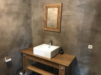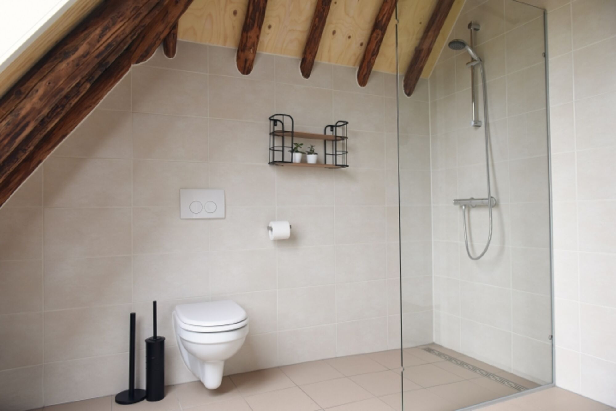 Im Obergeschoss befindet sich das Badezimmer mit Waschbecken, Toilette und geräumiger Dusche. Und zwei Schlafzimmer. Ein geräumiges Hauptschlafzimmer mit Doppelbett und ein Schlafzimmer mit Etagenbett.