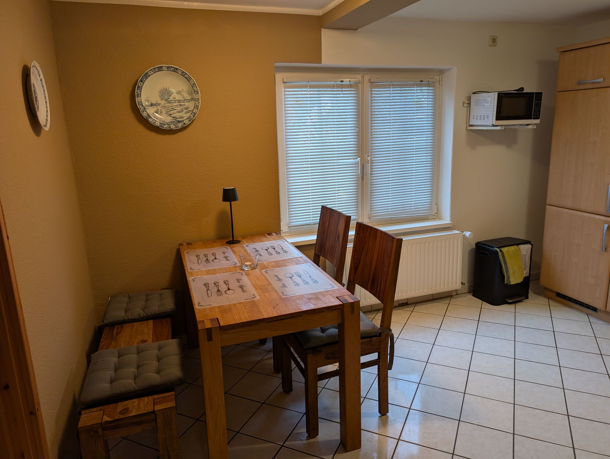 Cerankochfeld, Dunstabzugshaube, Gefrierschrank, Senseo-Kaffeeautomat, Geschirrhandtücher, Mülltüten, Essplatz in der Küche