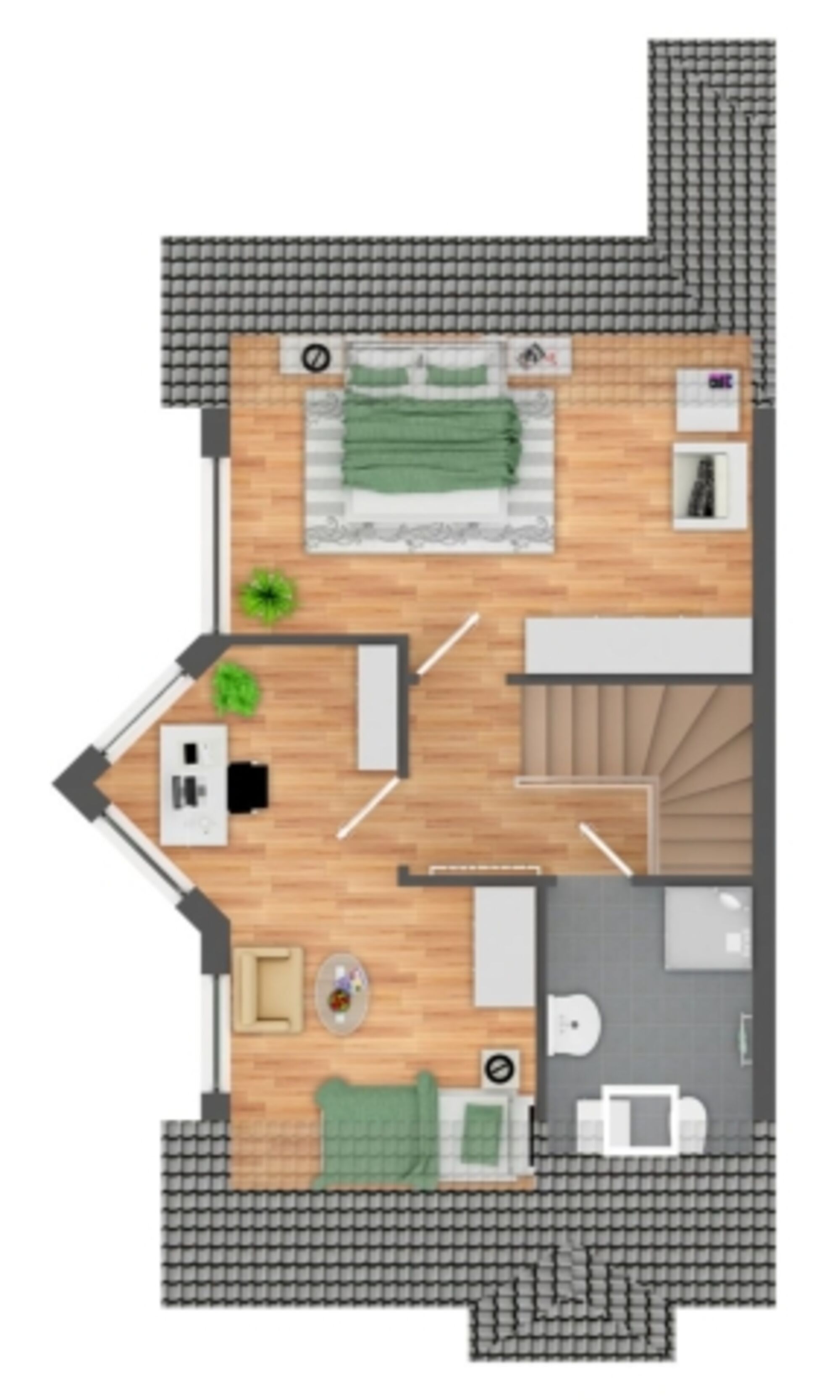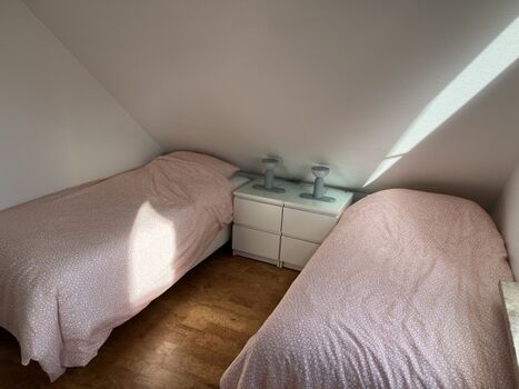 Im Obergeschoß befindet sich das Elternschlafzimmer mir einem 180x200 cm Boxspringbett und genügend Stauraum für Ihr Gepäck, Die Nachtkonsolen sind mit Lampen mit integrierter Ladefunktion ausgestattet. Das zweite Schlafzimmer ist mit zwei Einzelboxspringbetten 90x200 cm ausgestattet und ebenfalls mit Nachtkonsolen mit Lampen mit integrierter Ladefunktion. Das Badezimmer verfügt über eine ebenerdige Dusche, Waschbecken mit Unterschrank und eine WC.