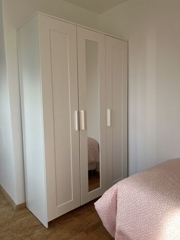 Einzelbett, Kommode, Spiegel, Leselampe am Bett, Fliegengitter