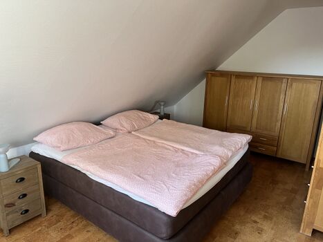 Doppelbett 1,80 x 2,00m, Boxspringbett, Kommode, Wecker, Leselampe am Bett, Fliegengitter