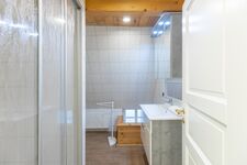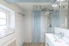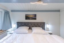 Über eine geschlossene Treppe erreichen Sie das Obergeschoss mit einem weiteren Schlafzimmer (160 x 200). Ein Highlight der Unterkunft ist der Wellness-Raum mit einer Sauna und dem Ruhebereich mit TV.