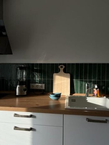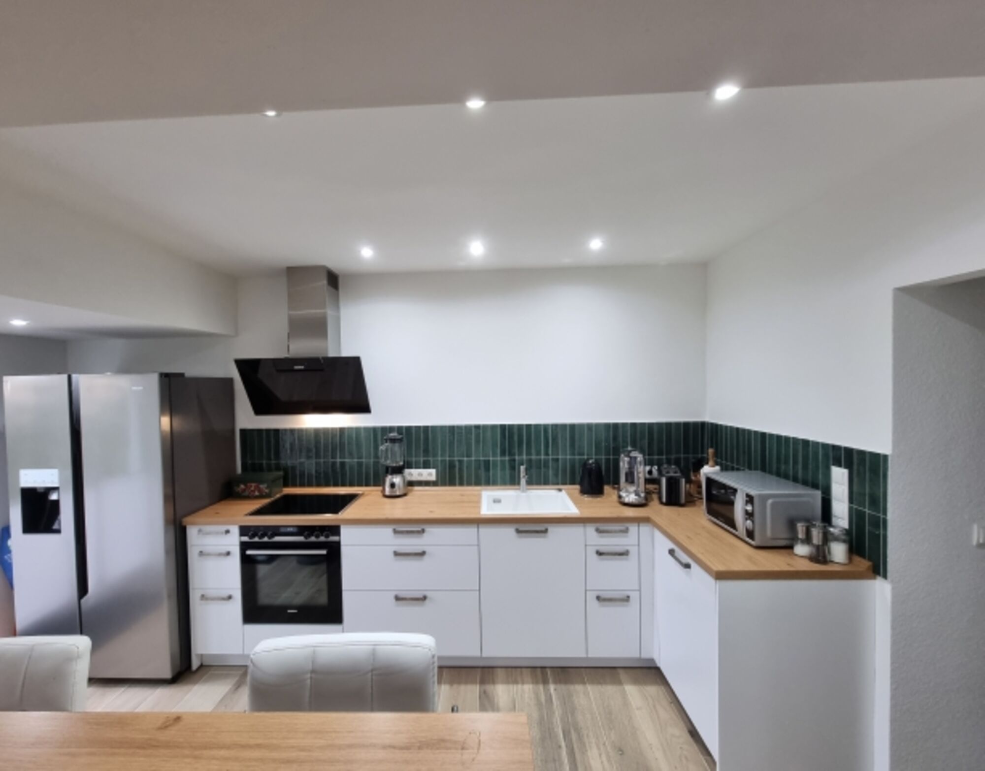4-Platten Herd, Cerankochfeld, Induktionsherd, Dunstabzugshaube, Kühlschrank mit Gefrierfach, Gefrierschrank, Kaffeevollautomat, Nespresso-Automat, Eierkocher, Mixer, Korkenzieher / Flaschenöffner, Geschirrhandtücher, Mülltüten, Essplatz in der Küche