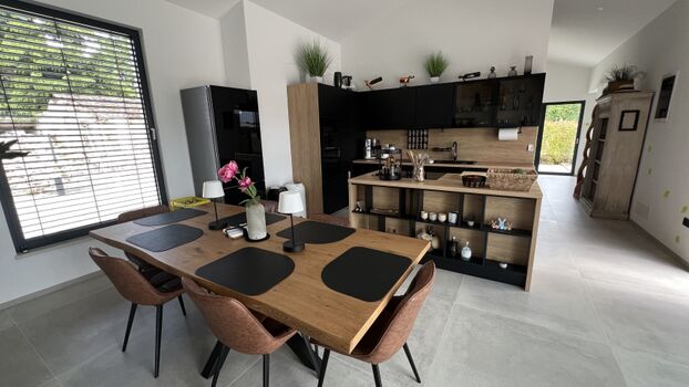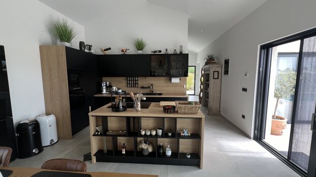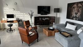 INNENBEREICH Schlafzimmer: 3 separate Schlafzimmer mit Doppelbetten für Platz bis zu 6 Personen, Nachttische am Bett, hochwertige Ausstattung, Freiraum zum Entspannen und Wohlfühlen. Bäder: Ein großes Bad mit Dusche und Badewanne, ein weiteres Badezimmer mit Dusche, separates Gäste-WC, Handtücher/Badetücher, 2 Haartrockner, Bademäntel. Wohnzimmer: Große Couch mit Schlafoption, Kamin, JBL-Soundgeräte, Gesellschaftsspiele, Schreibtisch zum Arbeiten, lichtdurchflutete Raumatmosphäre. Küche: Hochmoderner Küchenbereich mit Topausstattung, Esstisch mit Platz für bis zu 8 Personen, Thermomix, Heißluftfriteuse, Bora Induktionsplatte, Nespresso Kaffeemaschine.