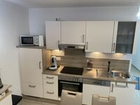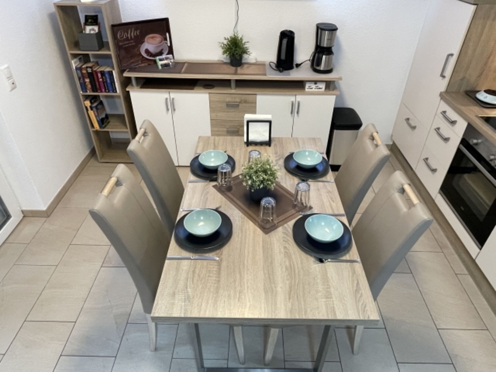 Cerankochfeld, Dunstabzugshaube, Senseo-Kaffeeautomat, Geschirrhandtücher, Mülltüten, Essplatz in der Küche