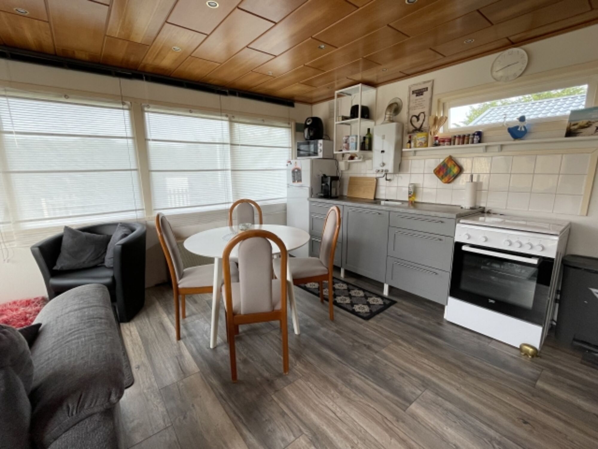 4-Platten Herd, Kühlschrank mit Gefrierfach, Senseo-Kaffeeautomat, Eierkocher, Mixer, Korkenzieher / Flaschenöffner, Gewürze (Salz, Pfeffer, Zucker), Öl / Essig, Geschirrhandtücher, Mülltüten, Essplatz in der Küche
