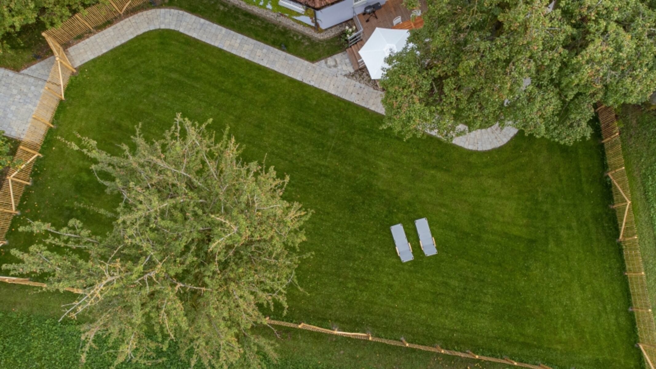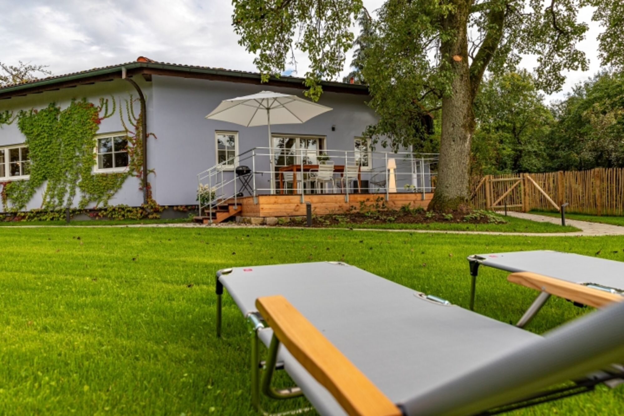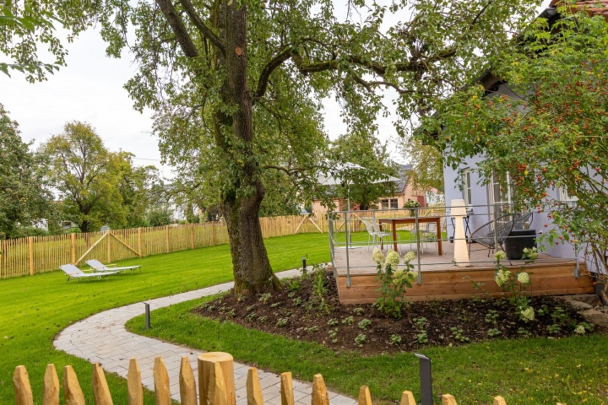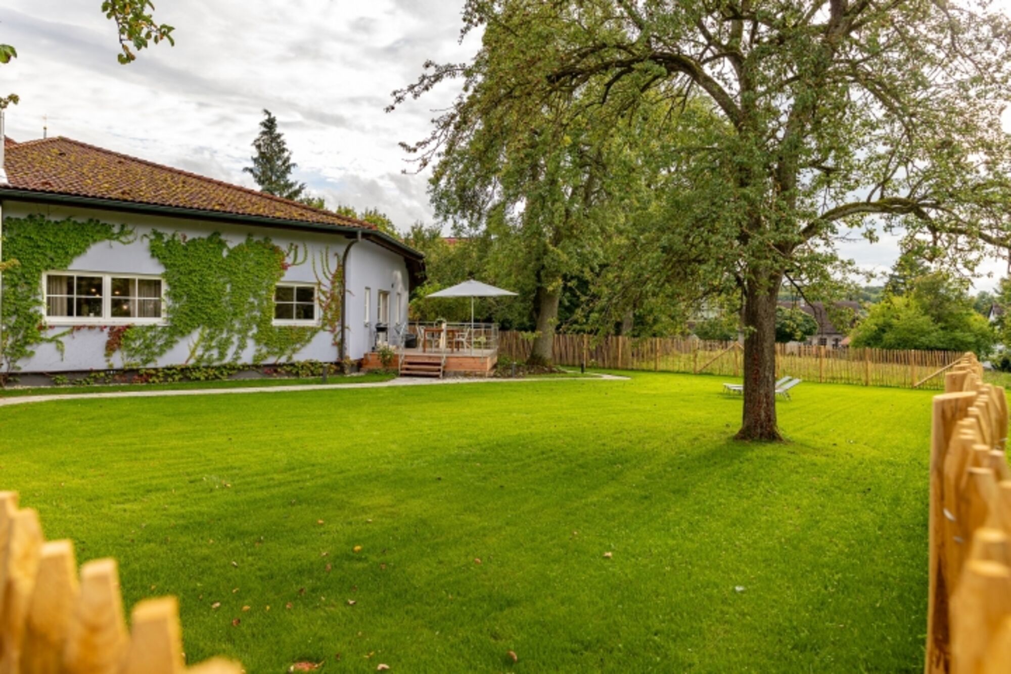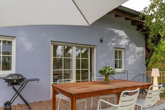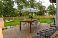 Der 1,5 m hoch eingezäunte Garten auf ca. 500 m² ist ein wahres Paradies für Hunde: sicher, großzügig und ruhig. Hier können Ihre Vierbeiner frei toben, spielen oder entspannt in der Sonne liegen, während Sie die Terrasse genießen. Die holzgedeckte Terrasse dient im Sommer als stilvolles Outdoor-Esszimmer, perfekt für Mahlzeiten im Freien, während Ihr Hund in Sichtweite entspannen kann.