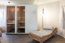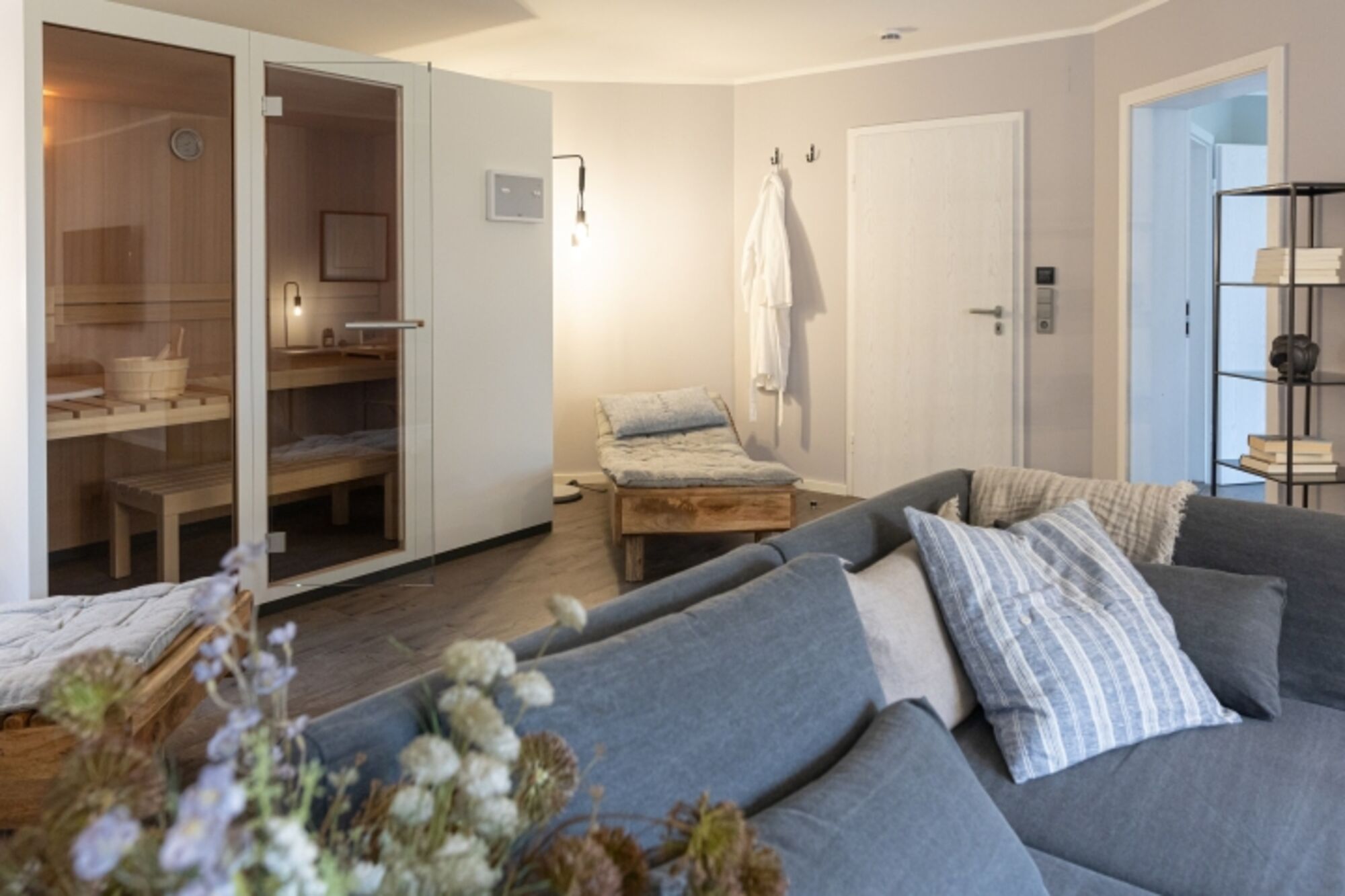 Im Innenbereich erwartet Sie eine Spa-Oase im Wohnzimmer: Eine kompakte Klafs-Sauna, komfortable Ruheliegen und ein Kamin sorgen auch an kühlen Wintertagen für Wohlbefinden. Die klare Farbgestaltung in Grau- und Indigotönen unterstreicht den eleganten Purismus und die ruhige, entspannende Atmosphäre.