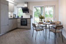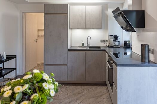 Induktionsherd, Dunstabzugshaube, Kühlschrank mit Gefrierfach, Gefrierschrank, Nespresso-Automat, Korkenzieher / Flaschenöffner, Gewürze (Salz, Pfeffer, Zucker), Öl / Essig, Geschirrhandtücher, Mülltüten, Essplatz in der Küche