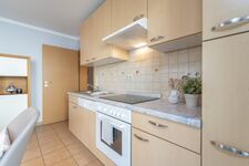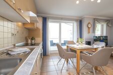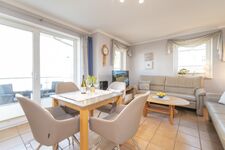 Der offene Wohn- und Küchenbereich mit seiner hochwertigen Einrichtung und zwei modernen Ledersofas wirkt ansprechend hell und verbreitet mit seinen warmen Sandtönen Entspannung pur. Für Unterhaltung sorgt ein Flatscreen-TV. Die moderne Einbauküche mit Essbereich ist voll ausgestattet mit Kühlschrank, Backofen, Cerankochfeld und Geschirrspüler.