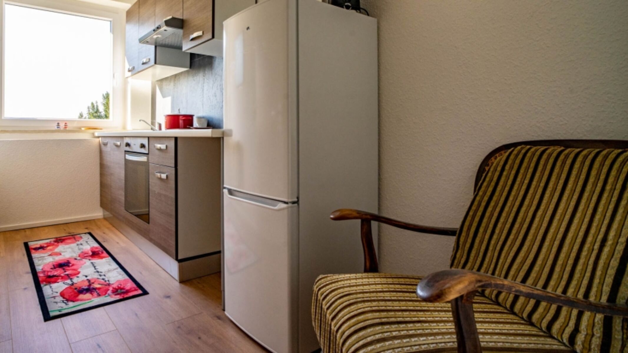 Die Küche ist mit allem Notwenigem ausgestattet. Im großzügigem Kühlschrank-Gefrierfach können z.B. mehrere Kilo BARF-Fleisch problemlos eingefroren werden. Ceranfeld-Herd mit Backofen.
