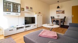 Im Wohnzimmer ist ein Essbereich eingerichtet. Das Sofa lässt sich zusätzlich schnell zu einem weiteren Bett umfunktionieren. Auch können wir Ihne Beistellbetten oder Kinderbetten anbieten.