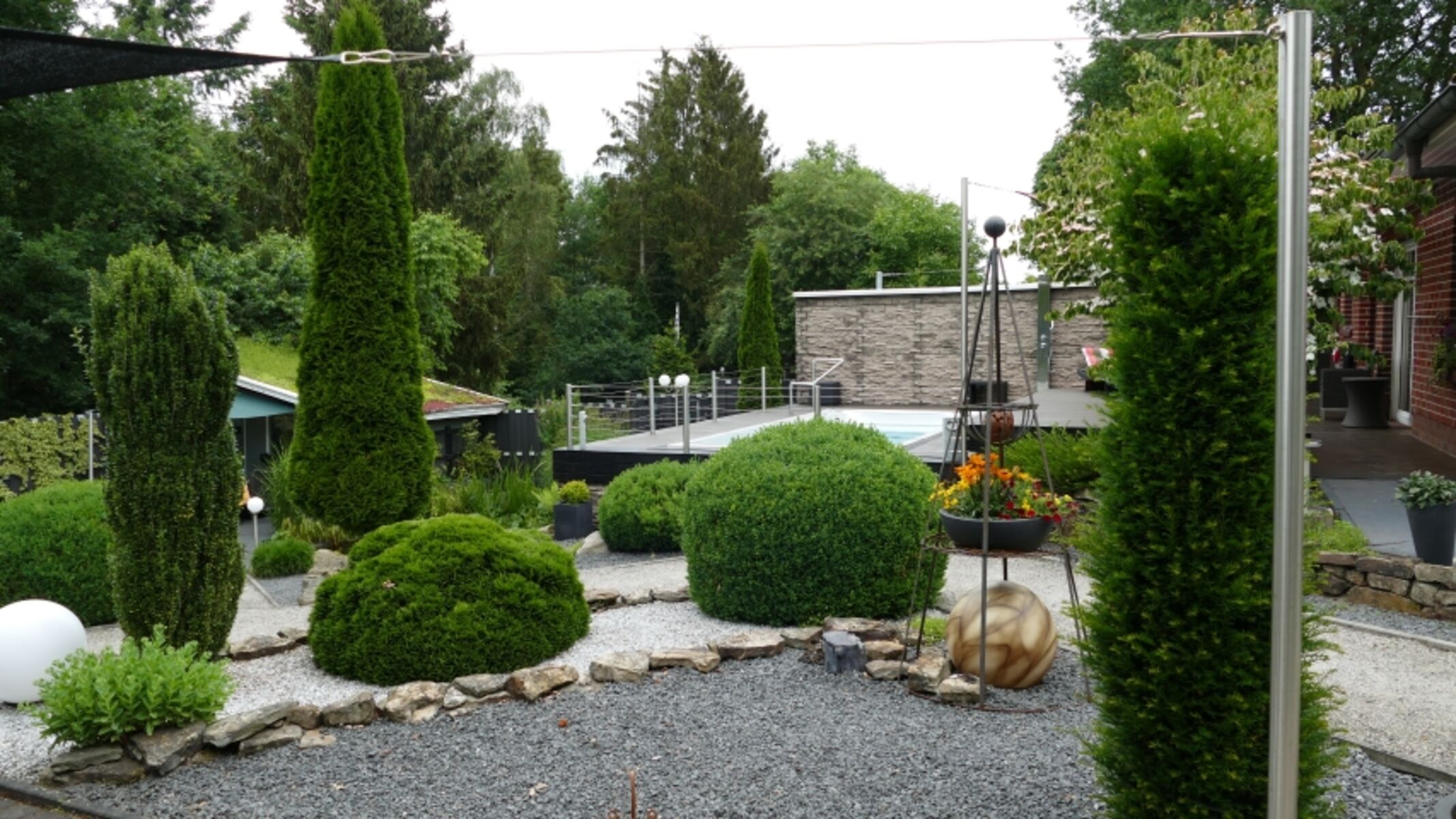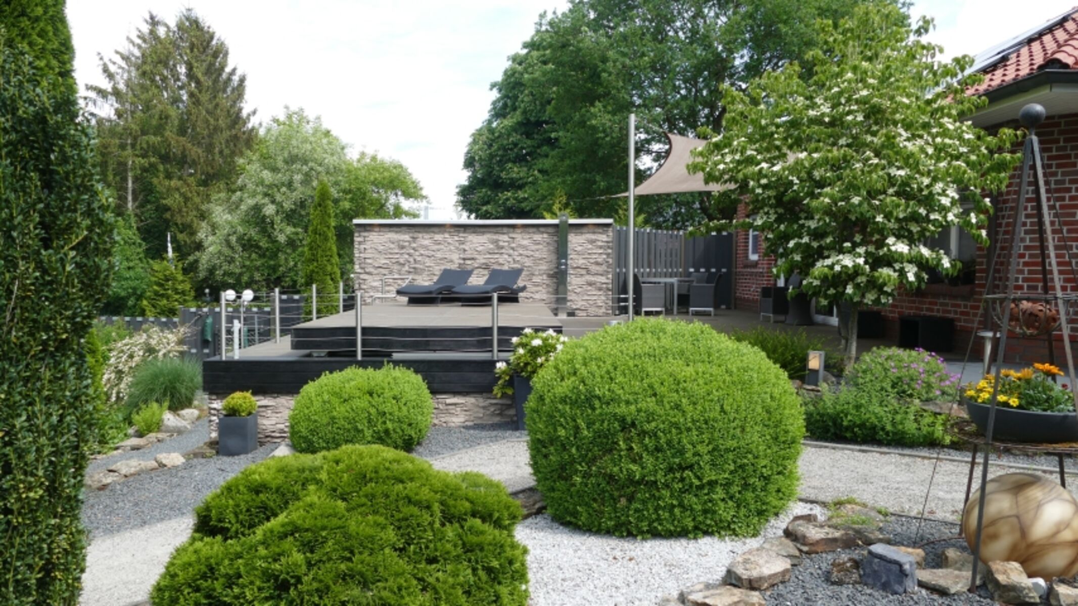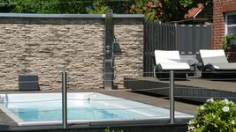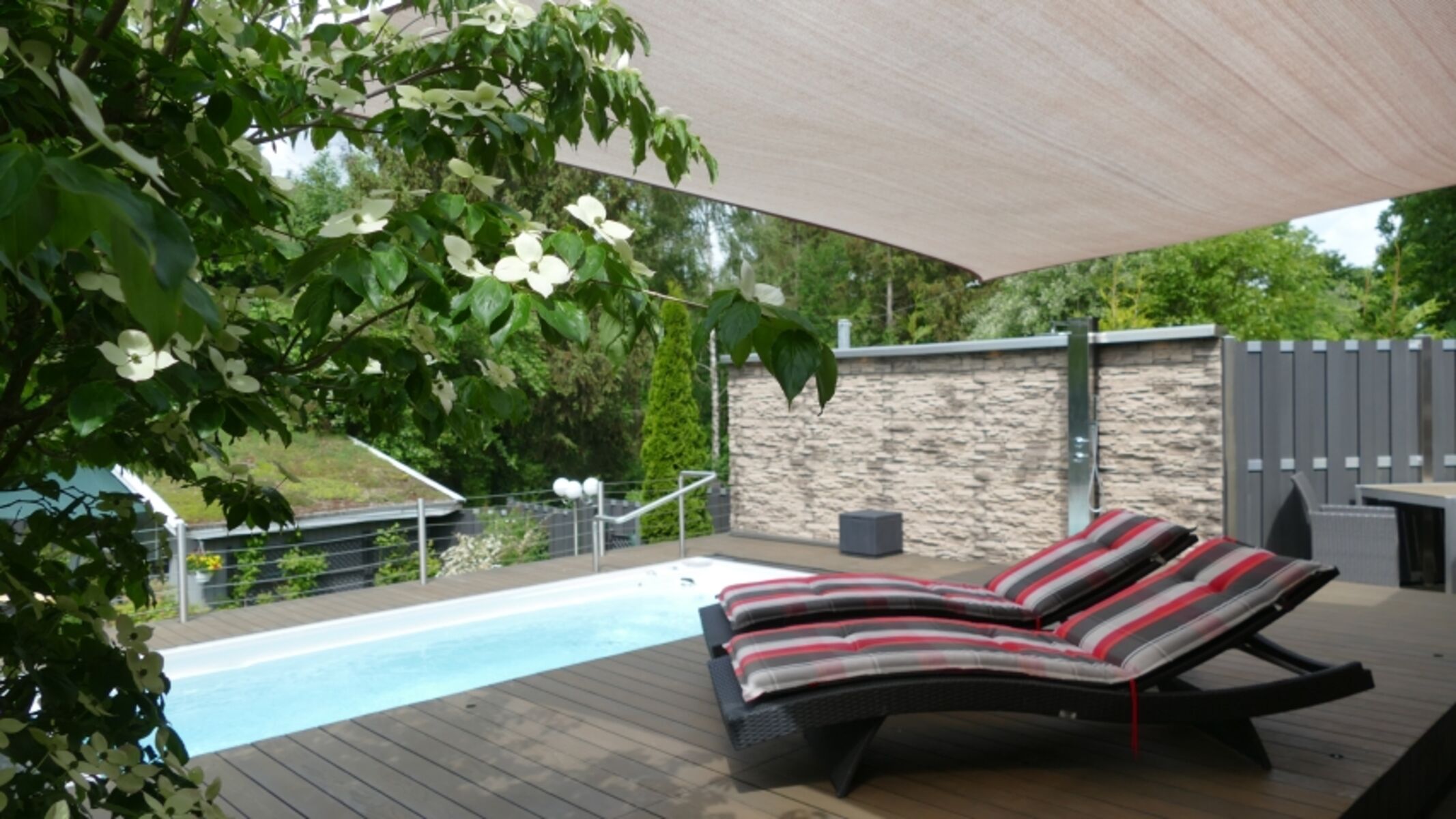 Neben dem beheizten Pool mit Solardusche, Sonnendeck mit Liegen und Strandkorb stehen mehrere Terrassen mit Gartenmöbeln, Markise oder Sonnensegeln sowie ein Gasgrill zur Verfügung.