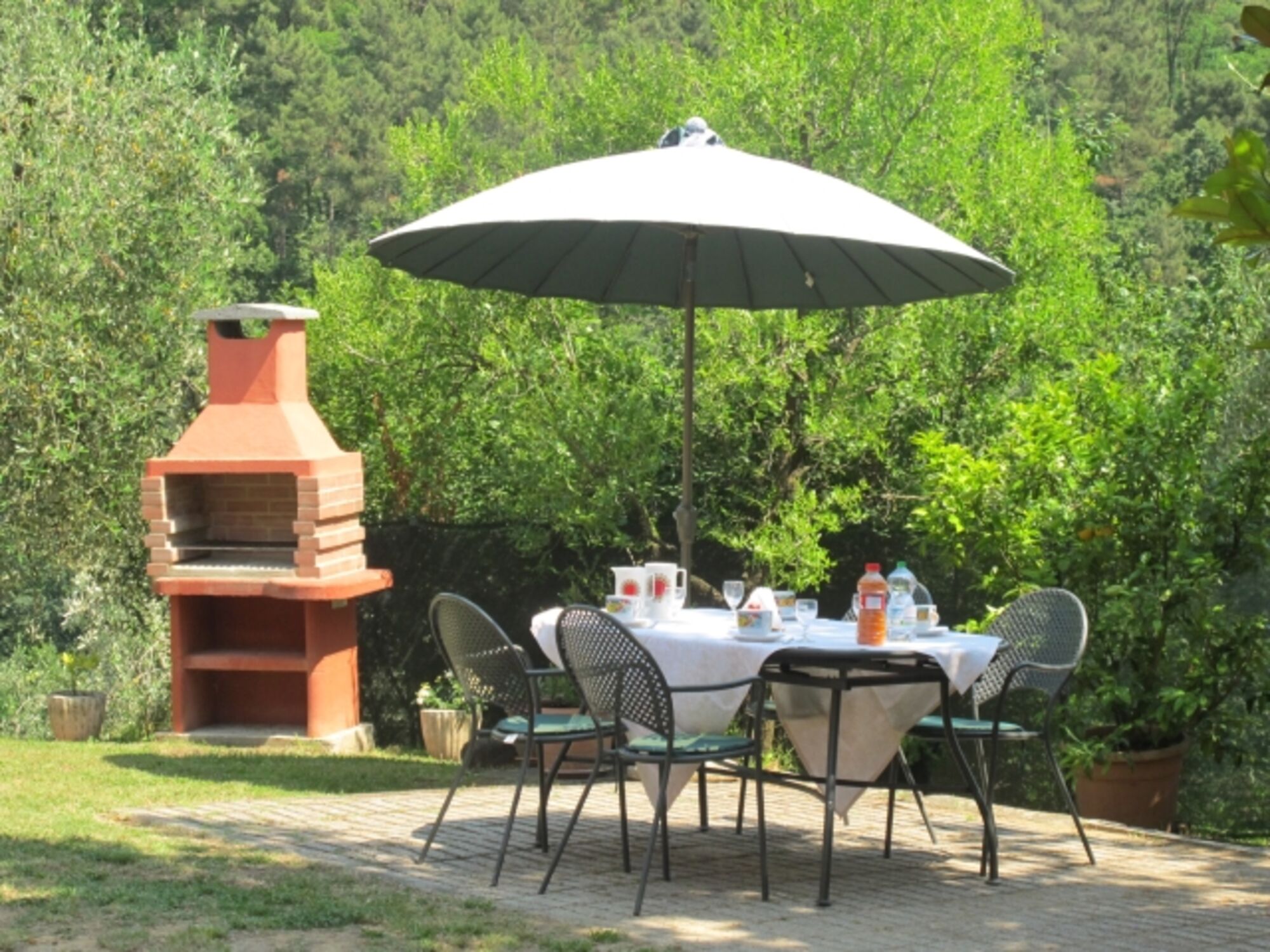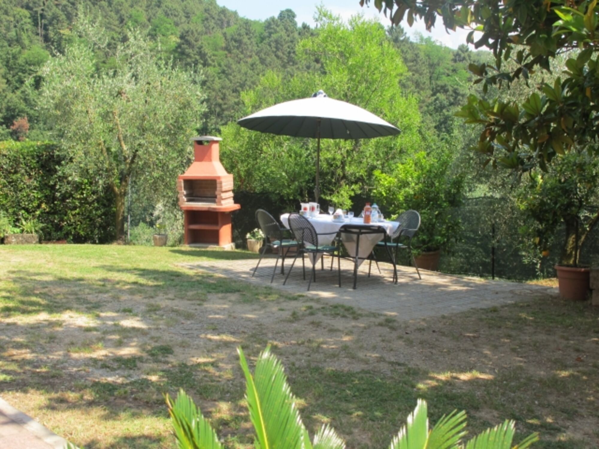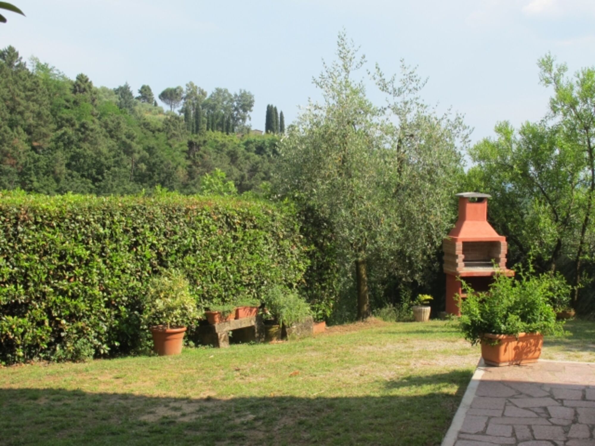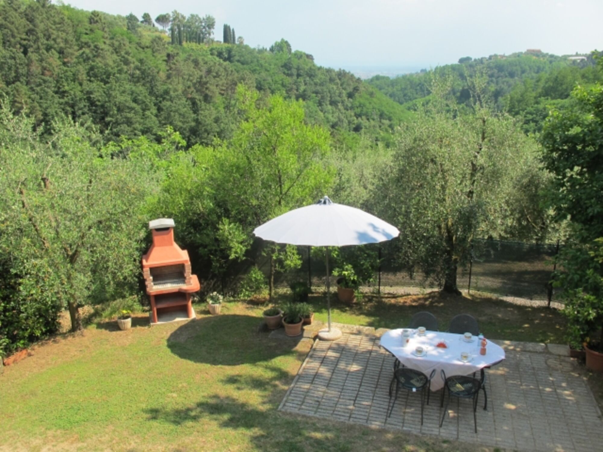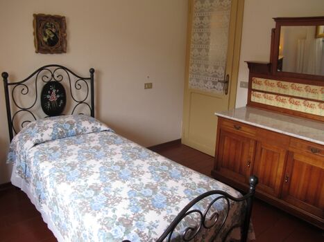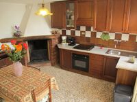 Durch den Haupteingang gelangen Sie in die Küche mit intaktem Kamin (Einbauküche, u. a. Geschirrspüler, 4flammiger Gasherd mit Backofen und Dunstabzugshaube, Espresso- und Filterkaffeemaschine, Toaster, Wasserkocher, großer Kühlschrank im kleinen Abstellraum in der Küche). Hinter der Küche befindet sich ein Mehrzweckraum mit einem weiteren Kühlschrank, links davon liegt 1 von 2 Bädern mit Fenster (Duschkabine, WC, Bidet, Waschmaschine), rechts davon liegt der Keller mit Ausgang in den Garten. Links vom Haupteingang befindet sich das Wohnzimmer mit SAT-TV, WLAN. Eine Terracotta-Treppe führt in die erste Etage, die komplett mit Terracotta-Fußboden ausgestattet ist. Sie verfügt über ein weiteres Bad mit Fenster (Duschkabine, WC, Bidet) und 4 Schlafzimmer: Vom Einzelzimmer blicken Sie in die waldreichen Hügel und in den Garten mit Privatpool. 1 von 3 Doppelzimmern ist zusätzlich mit 1 Kinderbett ausgestattet. Von zwei Doppelbettzimmern genießen Sie den Blick in Olivenbäume und das Tal. Jedes Fenster ist mit Mückenschutz versehen.