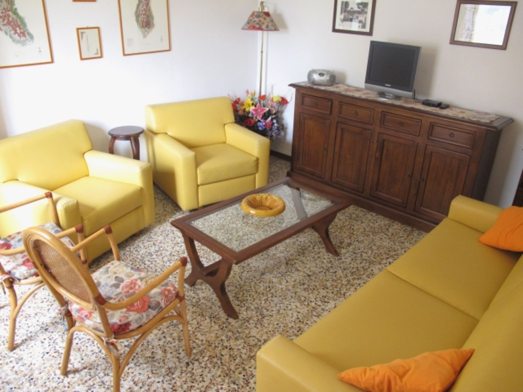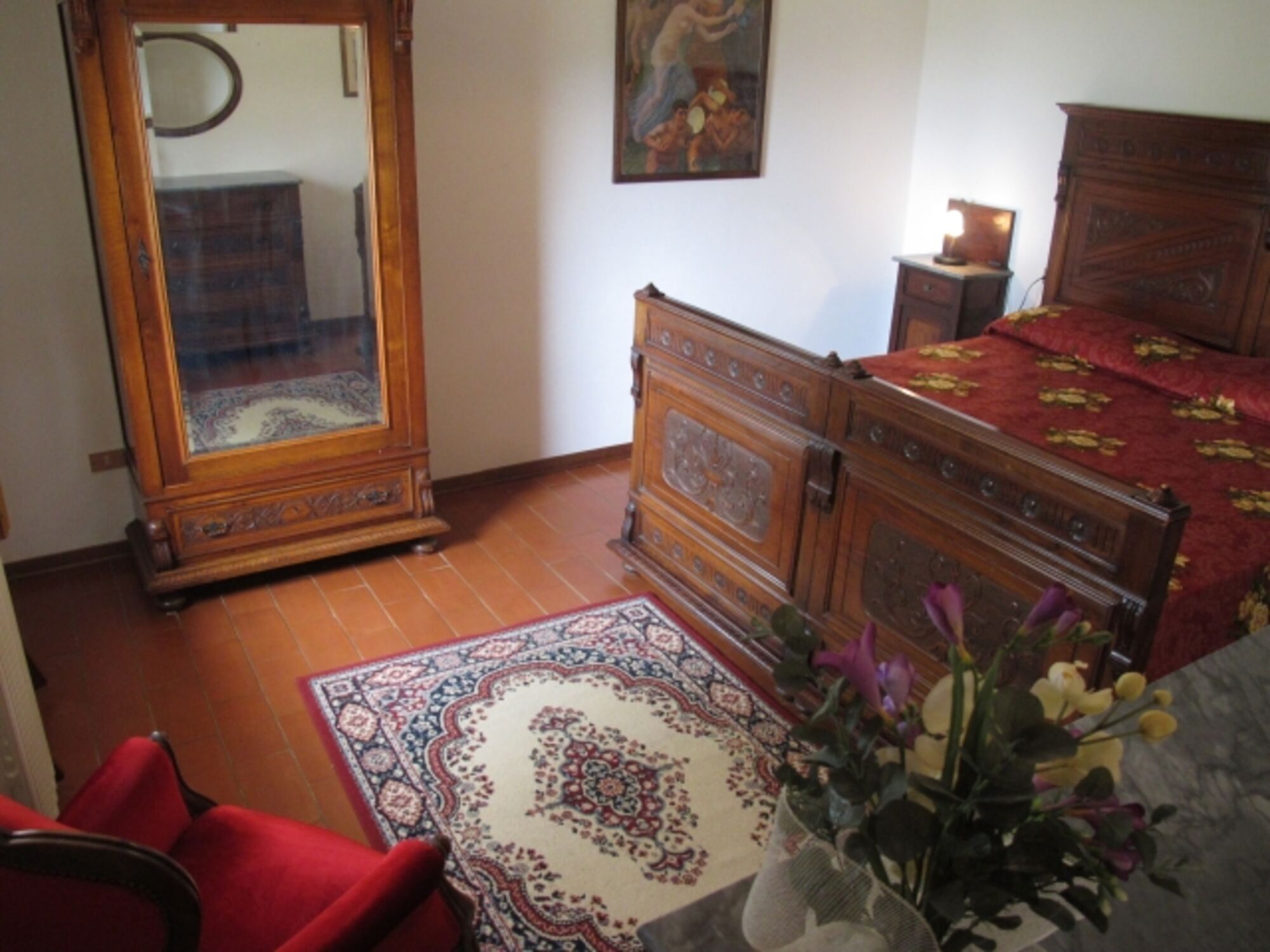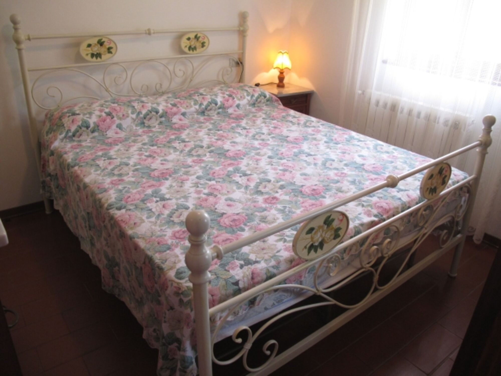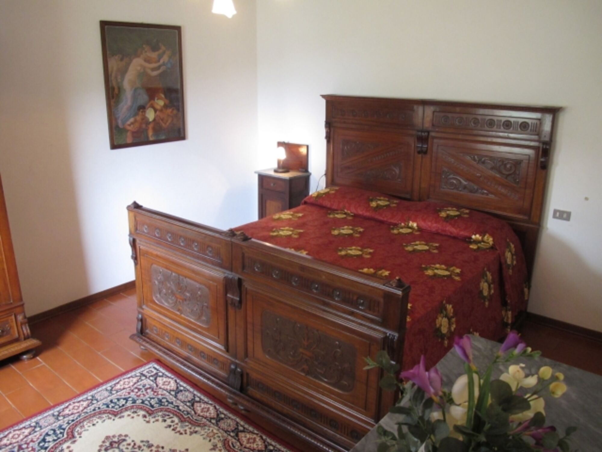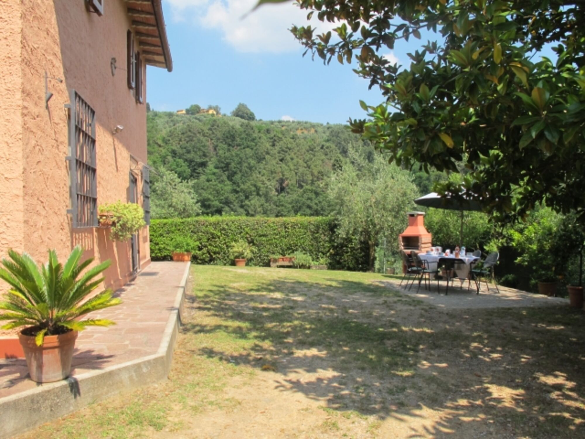 Durch den Haupteingang gelangen Sie in die Küche mit intaktem Kamin (Einbauküche, u. a. Geschirrspüler, 4flammiger Gasherd mit Backofen und Dunstabzugshaube, Espresso- und Filterkaffeemaschine, Toaster, Wasserkocher, großer Kühlschrank im kleinen Abstellraum in der Küche). Hinter der Küche befindet sich ein Mehrzweckraum mit einem weiteren Kühlschrank, links davon liegt 1 von 2 Bädern mit Fenster (Duschkabine, WC, Bidet, Waschmaschine), rechts davon liegt der Keller mit Ausgang in den Garten. Links vom Haupteingang befindet sich das Wohnzimmer mit SAT-TV, WLAN. Eine Terracotta-Treppe führt in die erste Etage, die komplett mit Terracotta-Fußboden ausgestattet ist. Sie verfügt über ein weiteres Bad mit Fenster (Duschkabine, WC, Bidet) und 4 Schlafzimmer: Vom Einzelzimmer blicken Sie in die waldreichen Hügel und in den Garten mit Privatpool. 1 von 3 Doppelzimmern ist zusätzlich mit 1 Kinderbett ausgestattet. Von zwei Doppelbettzimmern genießen Sie den Blick in Olivenbäume und das Tal. Jedes Fenster ist mit Mückenschutz versehen.