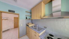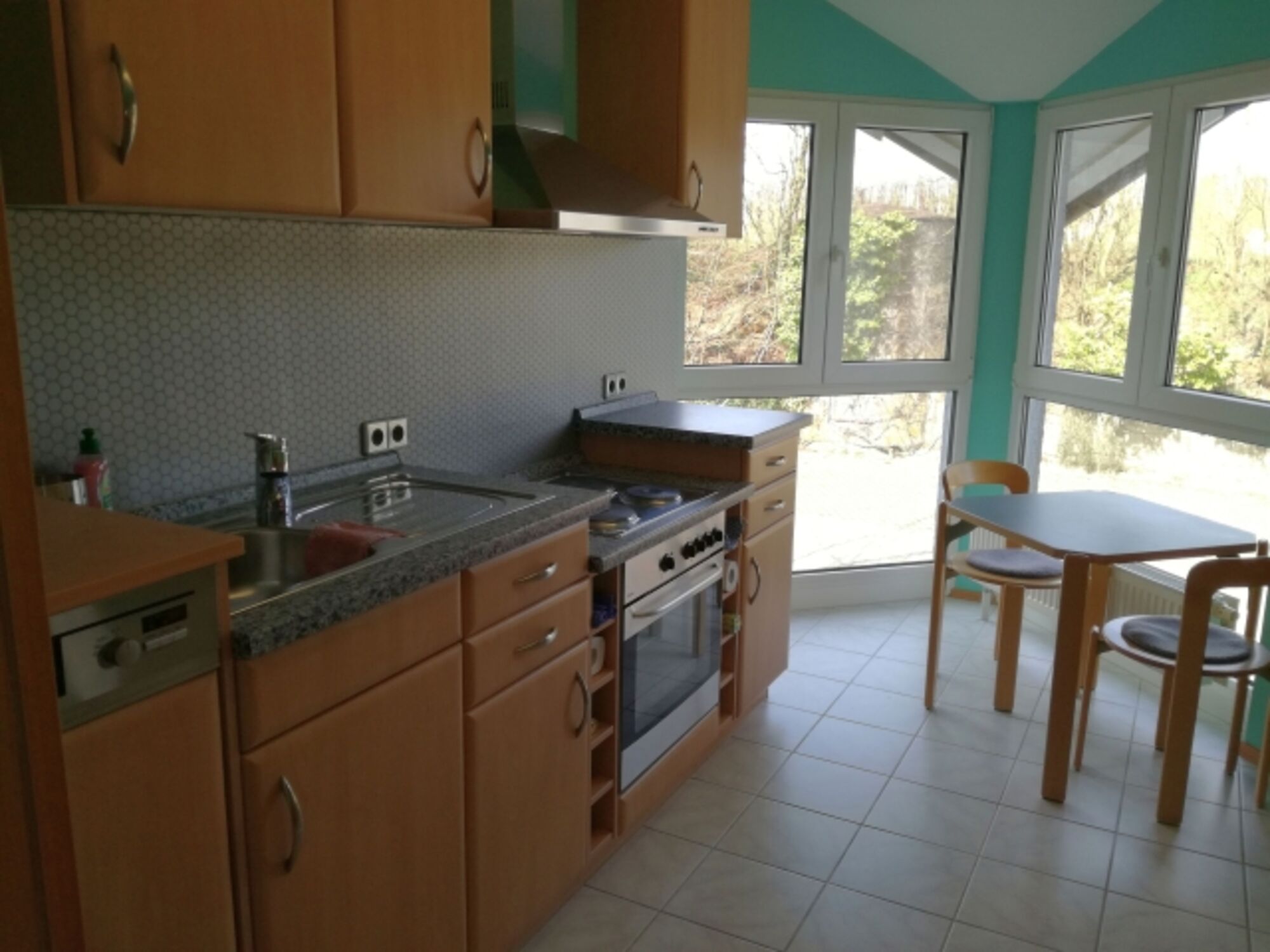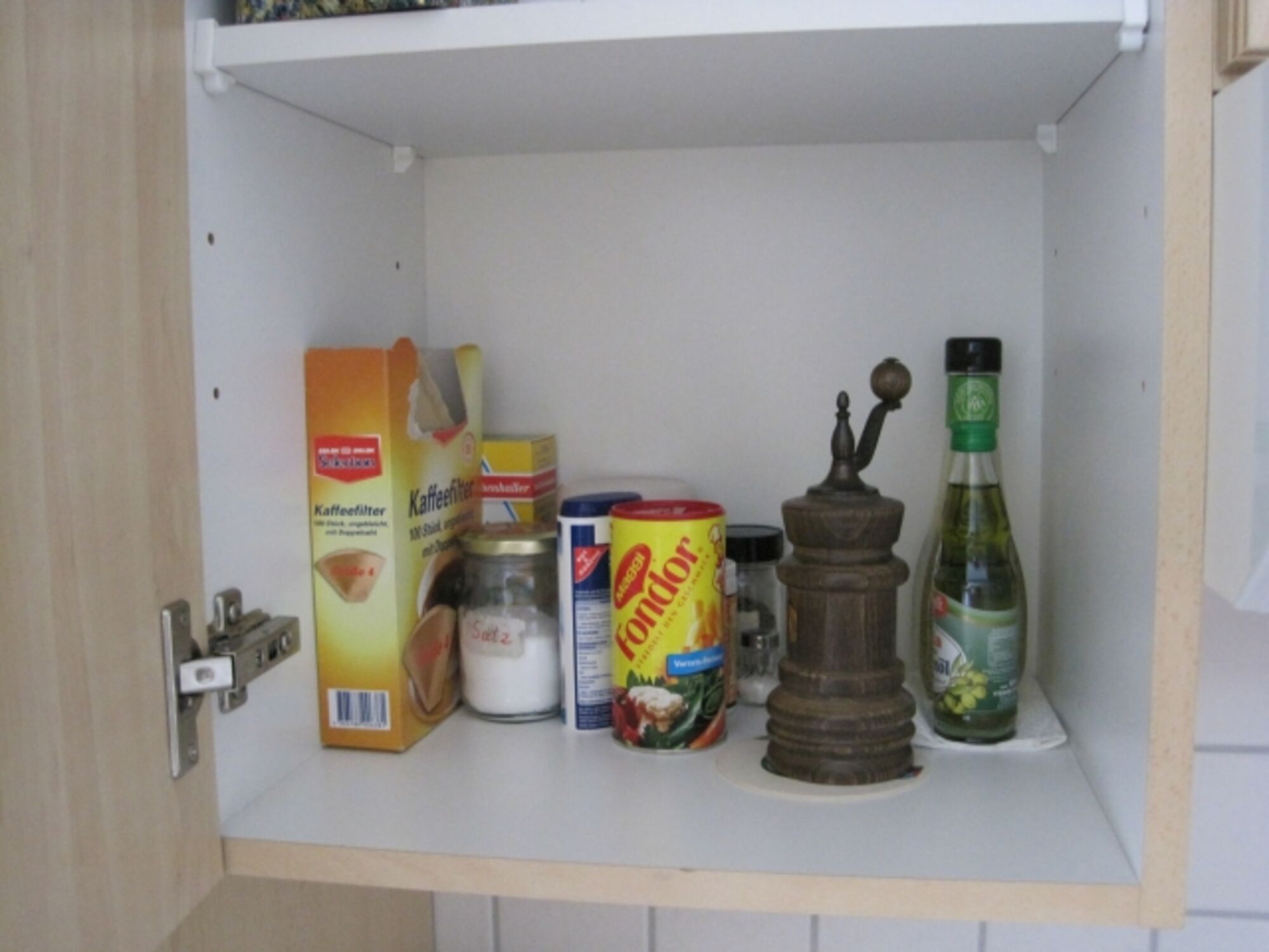 4-Platten Herd, Cerankochfeld, Dunstabzugshaube, Kühlschrank mit Gefrierfach, Senseo-Kaffeeautomat, Eierkocher, Korkenzieher / Flaschenöffner, Gewürze (Salz, Pfeffer, Zucker), Öl / Essig, Geschirrhandtücher, Mülltüten, Essplatz in der Küche