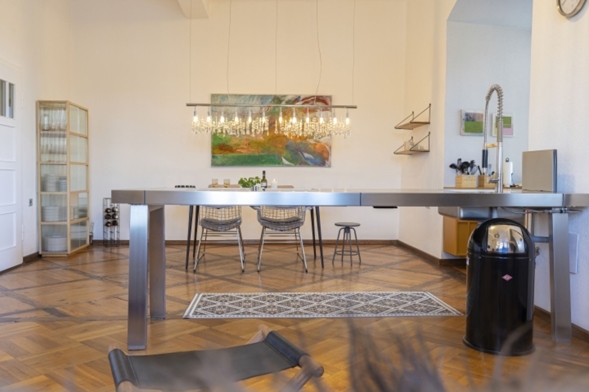 Cerankochfeld, Kühlschrank mit Gefrierfach, Gefrierschrank, Korkenzieher / Flaschenöffner, Gewürze (Salz, Pfeffer, Zucker), Öl / Essig, Geschirrhandtücher, Mülltüten, Essplatz in der Küche