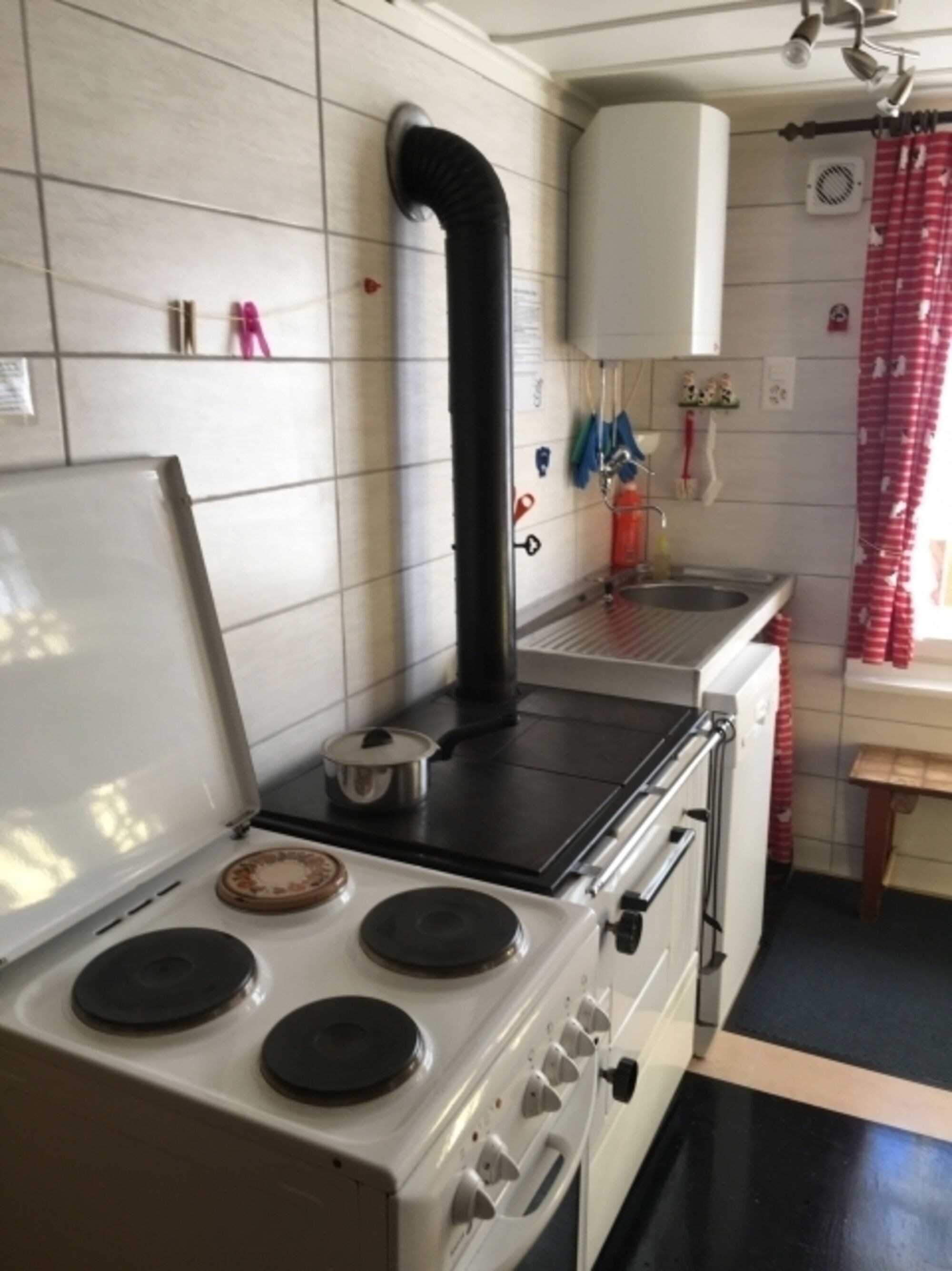 Sehr gut eingerichtete Küche mit Elekto-Herd und Backofen, Holzofen. Kochen auf dem Holzofen ein Hit.